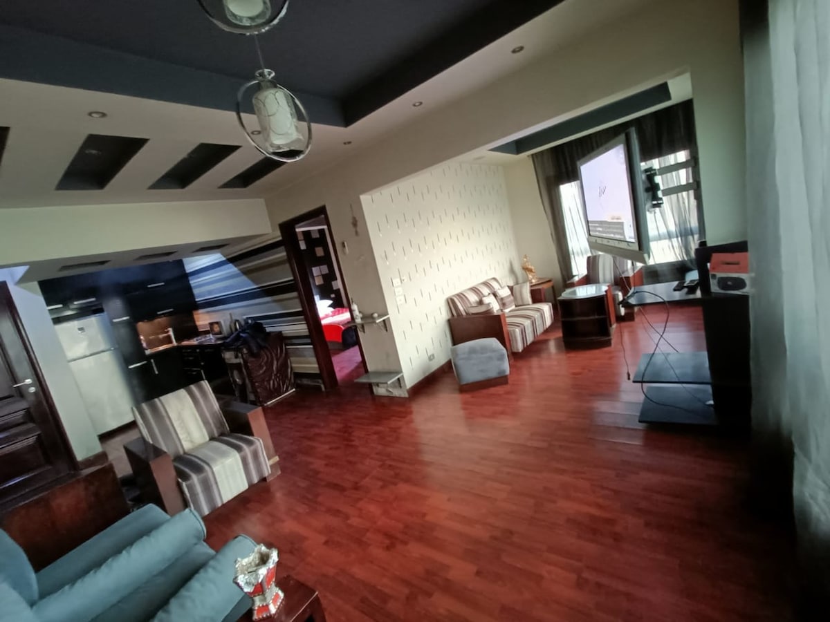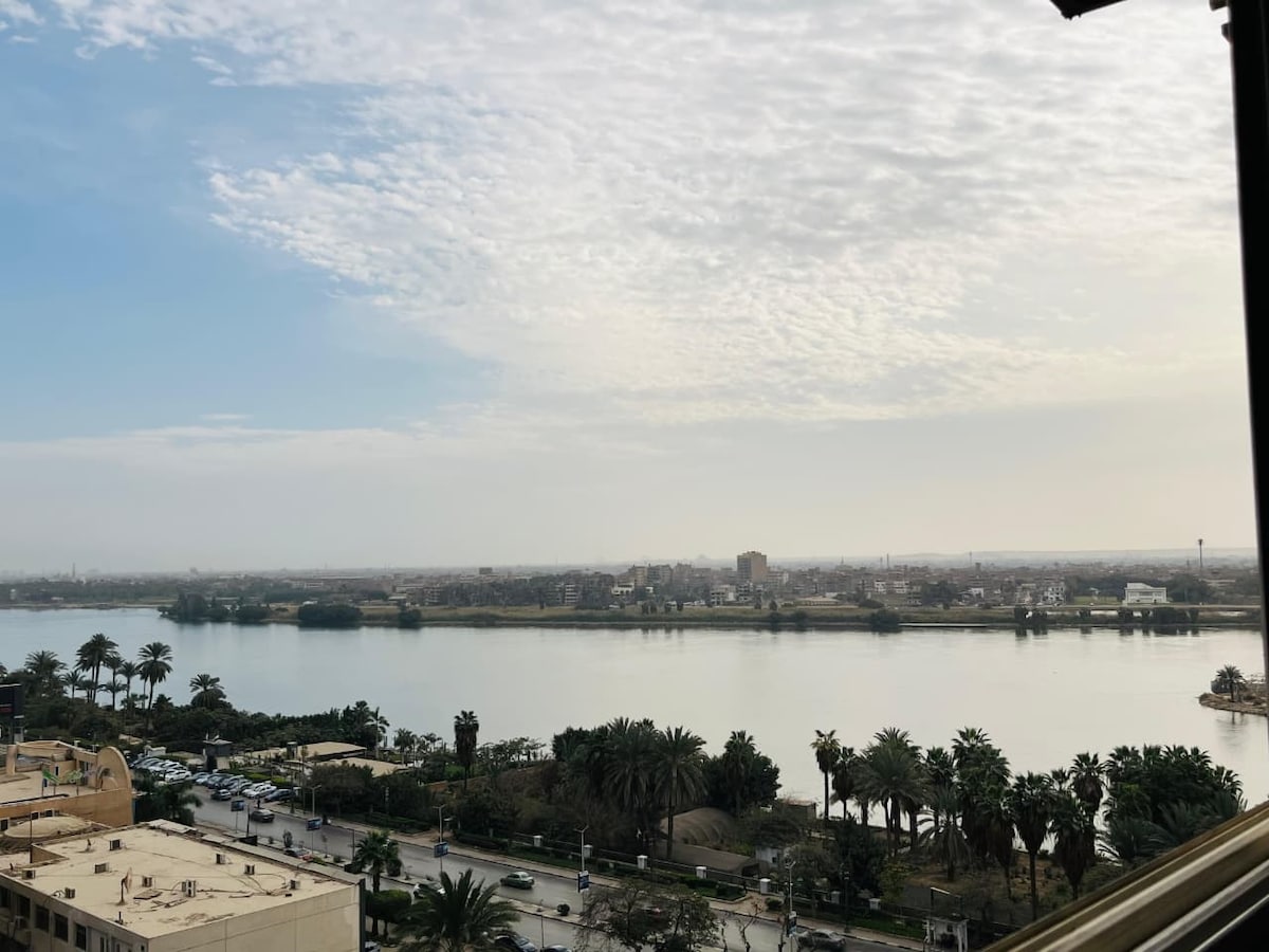 Modern Appartment front nile river 2-bedroom apartment next to the Holiday Inn. Enjoy a direct Nile view from a private balcony. Fully air‑conditioned, with oil heaters, two bathrooms, and a fully equipped kitchen. The living room features a 65-inch Smart TV with Netflix, Amazon Prime, live sports, and international channels. Fresh towels and bed linens provided for a comfortable stay.