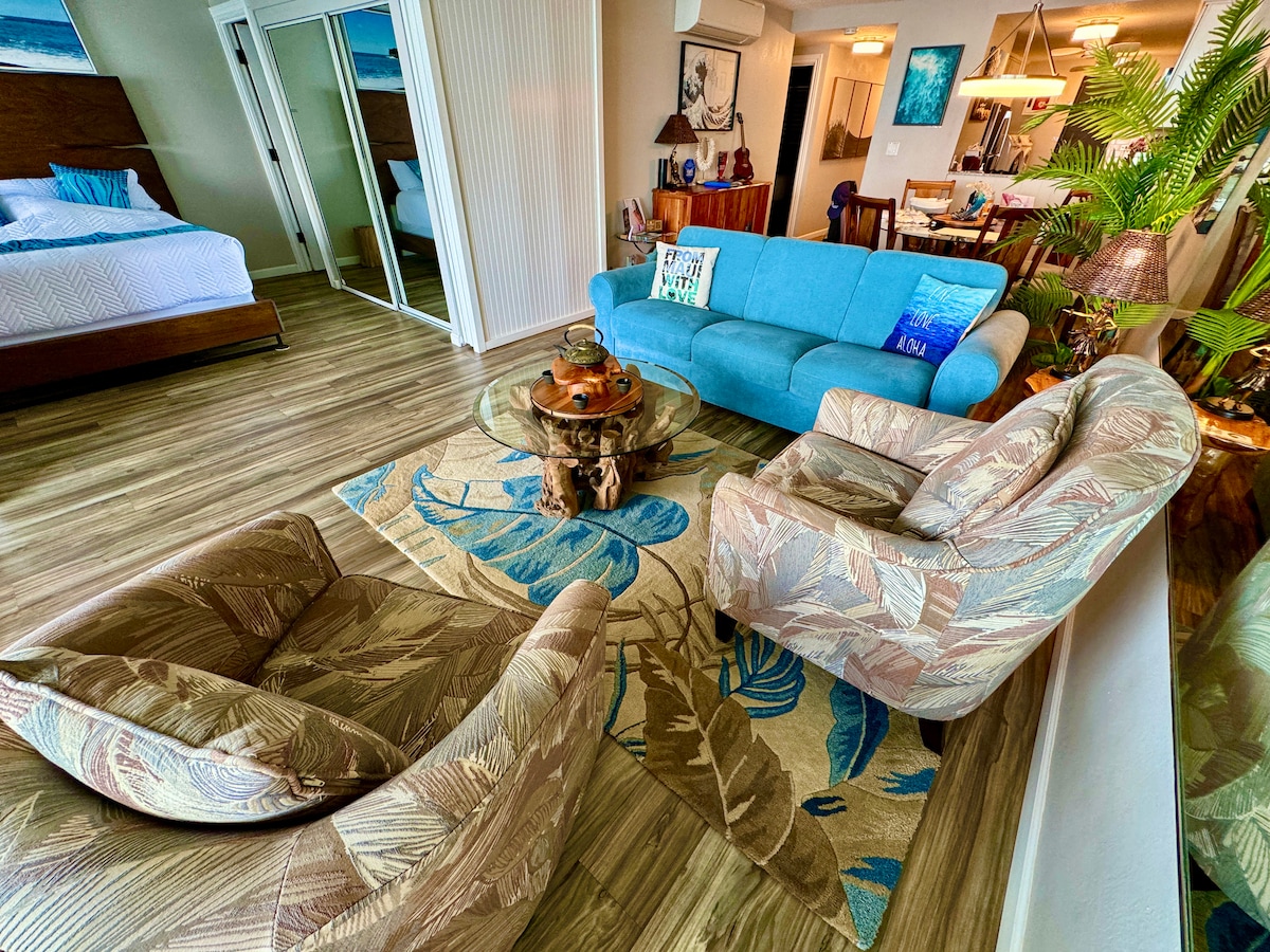 Welcome to your tropical paradise! Step into our ground floor 1-bedroom, 1-bathroom unit, just steps from the sparkling Pacific Ocean. Surrounded by vibrant Hawaiian plants, enjoy the pool, BBQs, and lush green space. Ideal for families or a romantic getaway, it's a short walk to the stunning 6-mile Sugar Beach. Relax on your lanai and witness Hawaii's longest curl wave, along with mesmerizing sunrises and sunsets. You can spot friendly sea turtles swimming and lounging on the beach!