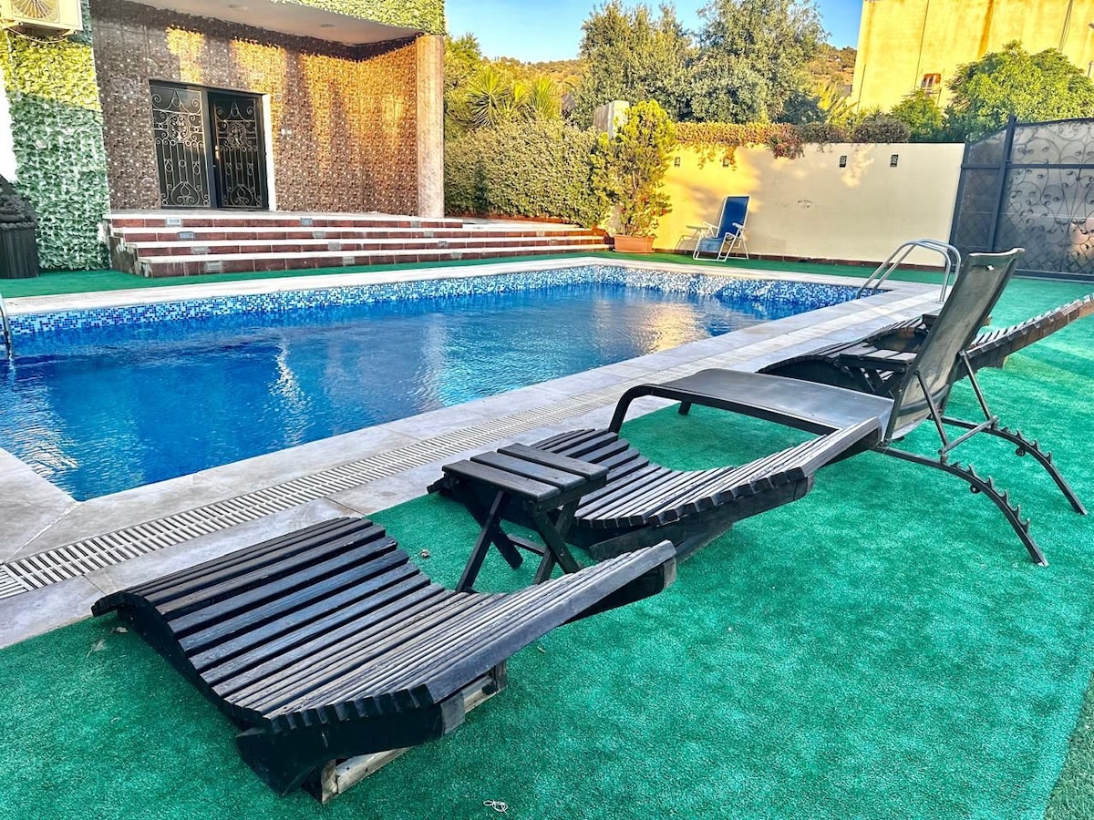 Unwind at this stunning mountain-top private resort with breathtaking views of the Zay and Ajloun forests and the Amman skyline. Relax by the pool or in the lush garden surrounded by fresh mountain air. Located in historic Gilad, Balqa Province, just 20 km from Amman, with local shops and restaurants minutes away. Features include AC in all rooms, central heating, a rooftop terrace with 360° views, and an onsite gardener/janitor for your convenience.