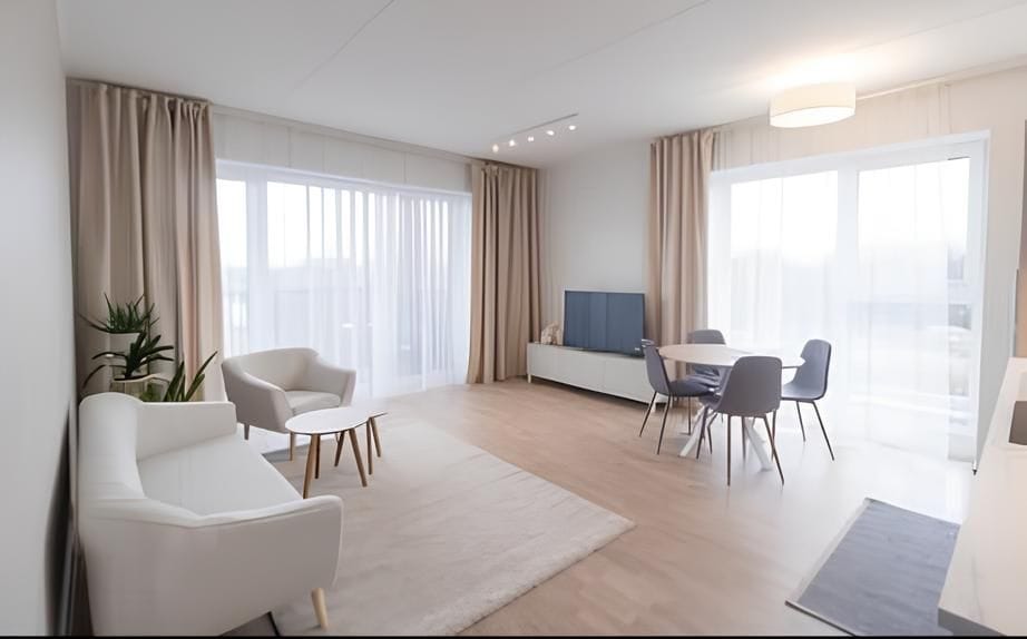 A quiet and modern apt 15min drive to centre of Tallinn 10 min walk to Viimsi Spa and Water park Nearest shopping 10 mins walking distance Many restaurants& home delivery (use wolt or Bolt food) Nice walking trails nearby Spacious terrace with furniture and plants Bathroom has a bath and a shower Kids playground Floor heating available (excluding May-September) Samsung Smart TV& speakers& Netflix Home office space Haabneeme beach nearby NB! Apt remains cool even with hot weather