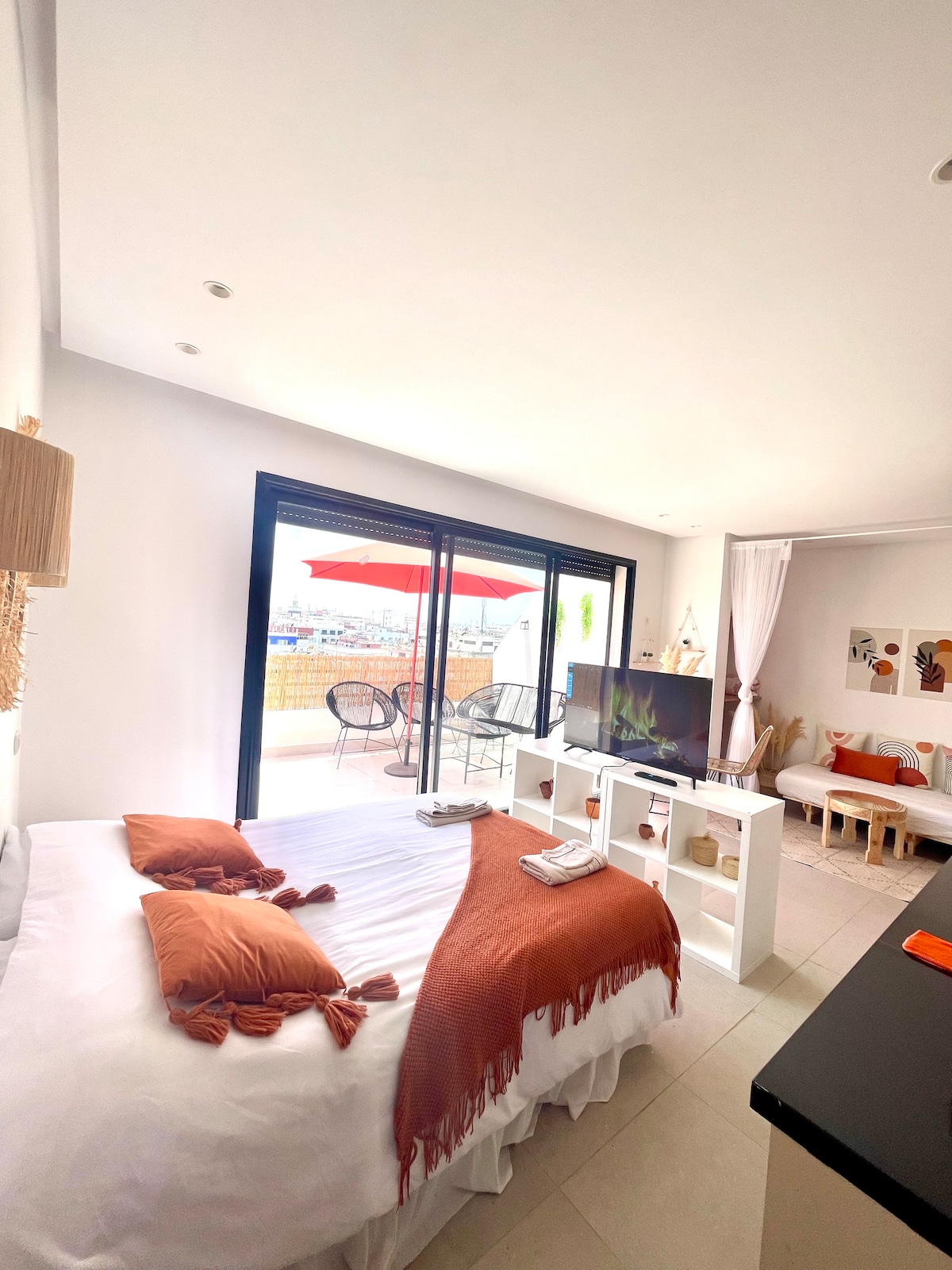 Charmant studio au cœur de Casablanca avec une vue dégagée et terrasse ensoleillée. Idéalement situé en plein centre-ville de Casa, ce studio au 7ᵉ étage vous séduira par son ambiance chaleureuse et sa décoration raffinée inspirée du style merrakchi. Sans vis-à-vis, il offre une grande terrasse baignée de soleil toute la journée, parfaite pour se détendre ou partager un repas en plein air. Le studio allie confort moderne et touches artisanales, créant un cocon accueillant en plein centre urbain.