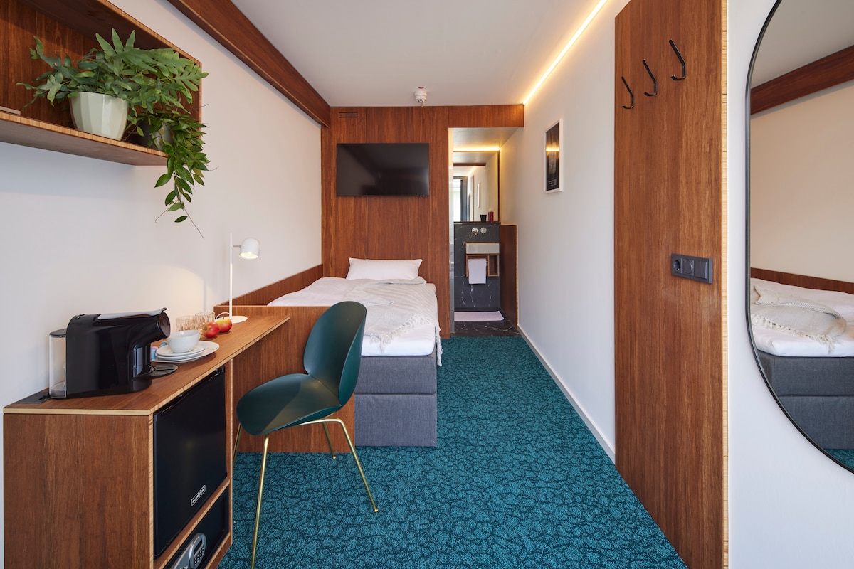 Welcome to TIN INN Erkelenz – our sustainable hotel concept built from recycled shipping containers. Enjoy high-quality, comfortable rooms with a minimalist design, no unnecessary frills. Your stay is 100% digital: check in and out via smartphone, unlock your room with one click, and experience modern, contactless hospitality designed for maximum convenience & flexibility. Plus: Your Co2 Footprint per night will only be 3,8kg CO2e if you stay at the TIN INN Erkelenz.