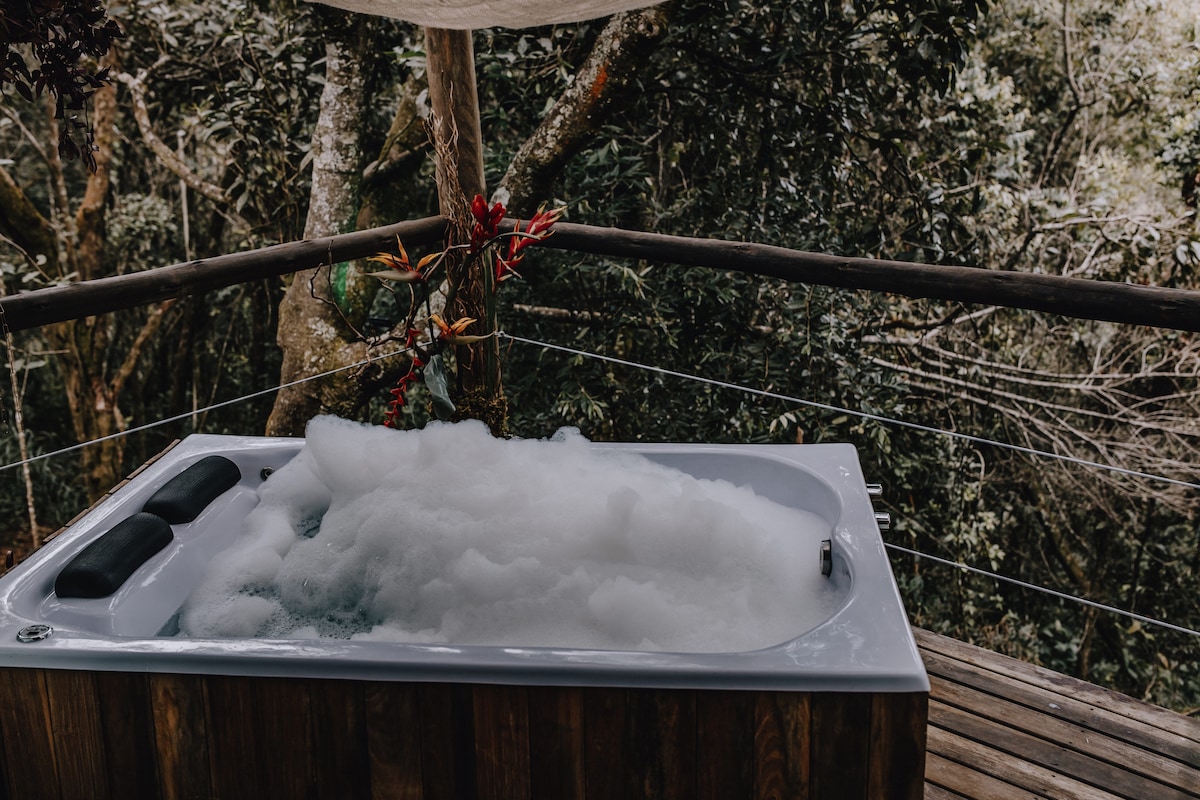 Uma cabana no meio de uma floresta privativa onde conexão com a natureza, romance e muito conforto andam juntos. Viva a experiência de dormir olhando as estrelas, ande sobre uma rede horizontal posicionada em meio a copa das árvores, o banheiro tem paredes de vídro, a cortina automática se transforma em um cinema. Na área externa além de churrasqueira suspensa a cabana oferece uma banheira vitoriana da década de 40 para um banho inesquecível. Tudo isso aliado a muito charme e tecnologia.