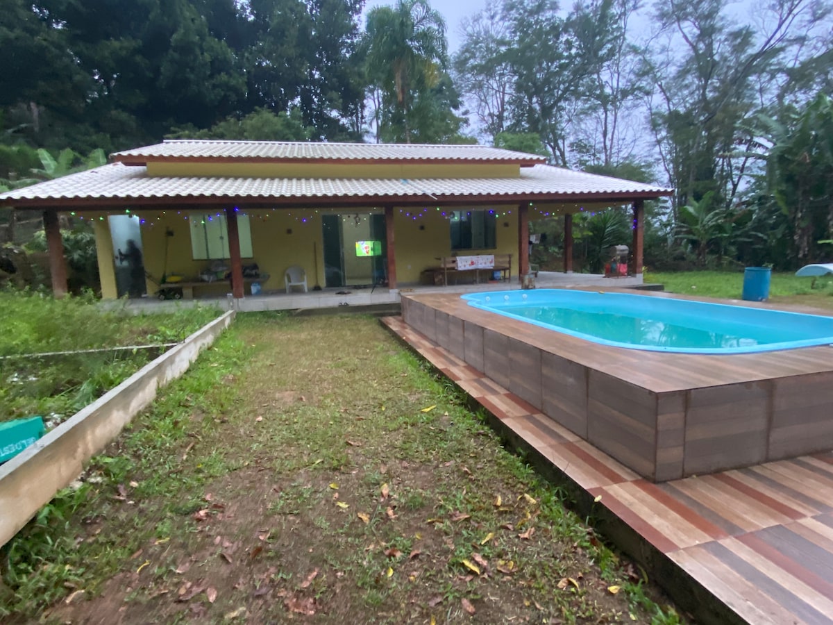 Casa rústica e aconchegante com amplo espaço externo com piscina, ideal para você curtir com a família e grupo de amigos. A casa é rodeada de montanhas e oferece uma bela vista do nascer do sol. Localizada bem próxima ao rio que margeia o condomínio, possui fácil acesso a um ponto de banho com águas claras (exceto em caso de chuva forte) e uma pequena “prainha” natural no leito do rio, ótima para relaxar.