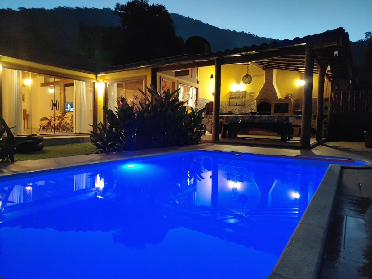 Casa rústica e aconchegante com amplo espaço externo com piscina, ideal para você curtir com a família e grupo de amigos. A casa é rodeada de montanhas e oferece uma bela vista do nascer do sol. Localizada bem próxima ao rio que margeia o condomínio, possui fácil acesso a um ponto de banho com águas claras (exceto em caso de chuva forte) e uma pequena “prainha” natural no leito do rio, ótima para relaxar.