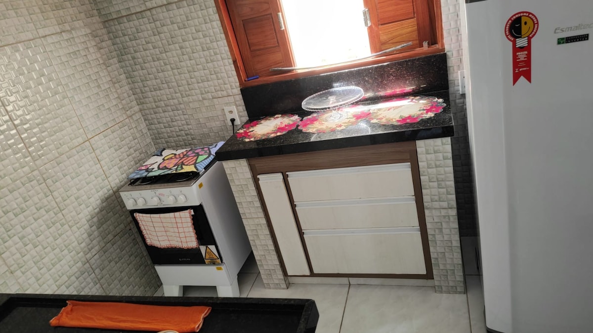 Casa em vila, com vaga p/ 1 carro Sala de visita :Sofá cama retrátil, TV 48 smart, mesa de centro e cent. de ar. Sala de jantar: balcão de granito e luminárias, mesa 8 cadeiras, geladeira, ventilador. Quarto:Ar , roupeiro casal , 1 cama casal, 1 Colchao casal, TV smart. cozinha externa: Mesa, armários, micro- ondas, ventilador, fogão 6 bocas e forno, pratos, talheres, faca, panelas,liquidificador, sanduicheira, cafeteira. Banheiro interno. Area lazer:piscina Area serviço:Tanque e Lavadora.