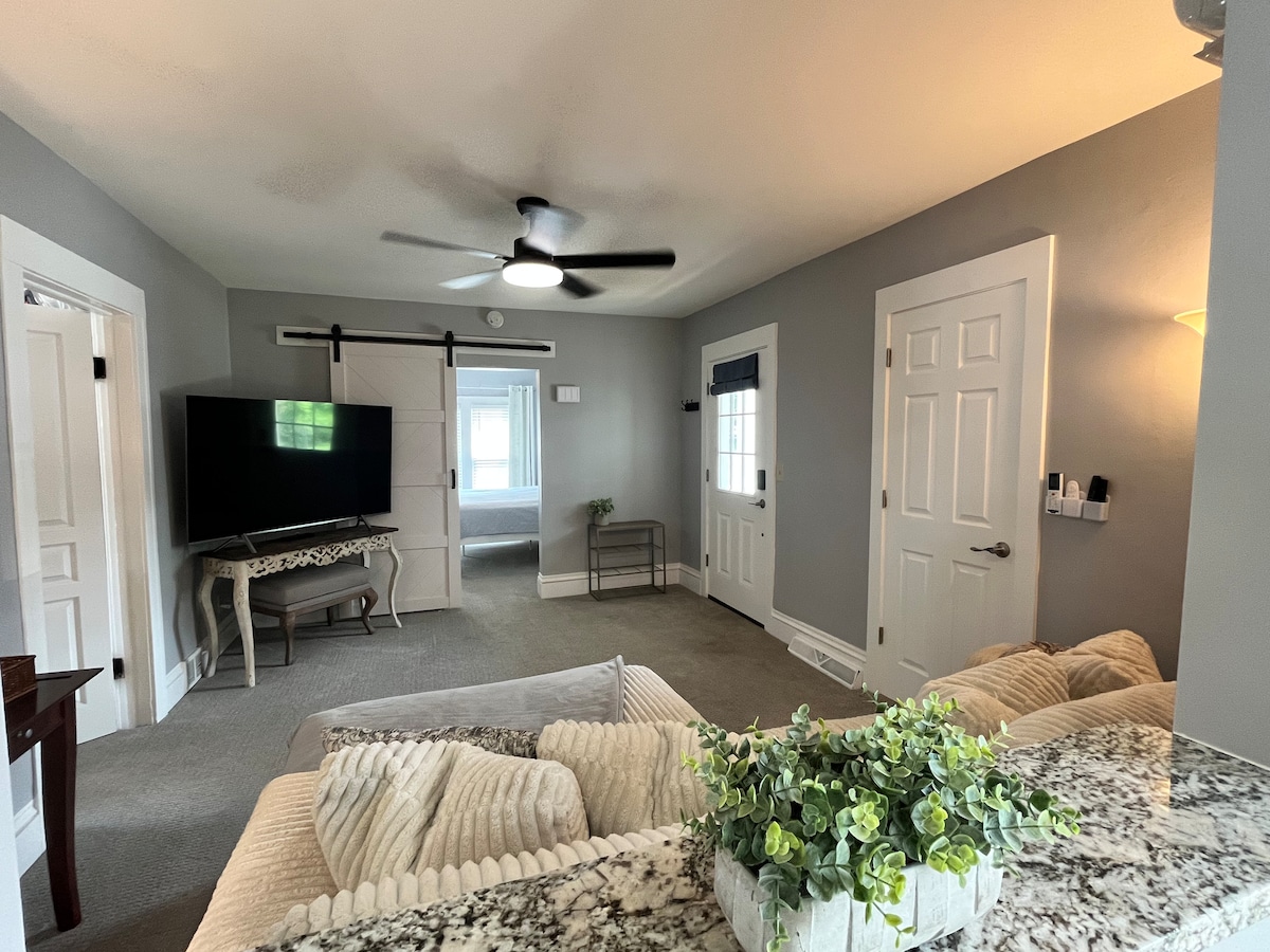 Nestled in the heart of Victor, NY this fully renovated apartment is a must stay! Located just north of Canandaigua Lake, south of the city of Rochester and 5 minutes from I-90! This charming apartment includes one full bathroom/laundry room, an open concept kitchen/living area, kitchen island with new stainless appliances and quartz counters. Two bedrooms, primary has a king bed and the second bedroom has two full beds. Apartment is located ABOVE/REAR of the main Victorian home.