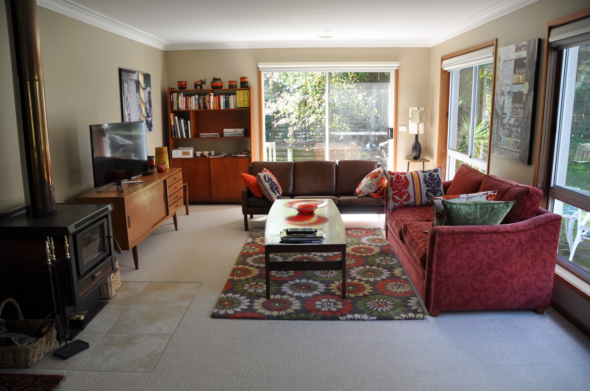 • Rest • Relax • Rejuvenate • Eat • Drink • Walk • Explore Experience one of the most beautiful areas of Regional Victoria. A comfortable bed, a wood fire. Cosy couches. The kitchen is newly renovated, with all you need to cook up a storm, and a glorious kitchen table at which to eat. Step onto the deck into the wide skies of Macedon, walk down to the grassy creek flat or across the road to the grassy woodlands of Barrm Birrm, place of many yam roots. And it is quiet.