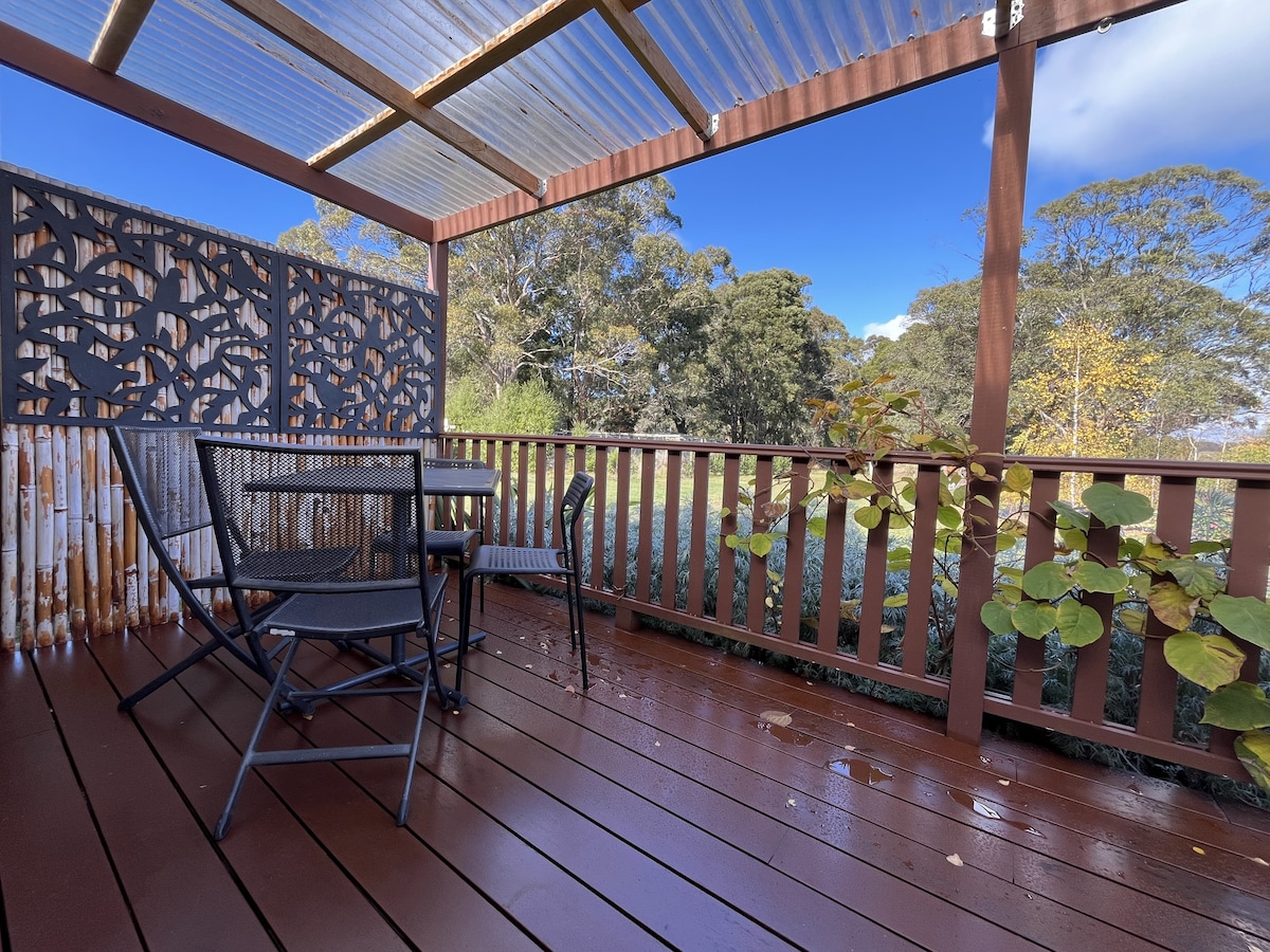 Kick back in this tranquil self-contained pad with private entrance and deck or enjoy sitting outside by the shared fire pit area. Stroll into town in just 10mins. Situated on the edge of to the Wombat walking trail to enjoy a hike through the bush to the historic race track. Enjoy the large private bathroom with heated floors and comfortable living & bedroom with reverse cycle AC. The Kitchenette is equipped with microwave and single induction hot plate for heating ready-made food. Come stay!