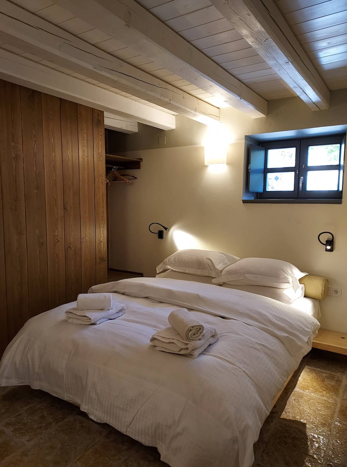 A typical double room in our guesthouse has two single beds, one next to the other and maybe a sofa bed with an ergonomic mattress or a convertible sofa bed that is that is recommended for use by children. These type of rooms cost 50-60 euros depending on weather or not you would also like breakfast or not. There is no charge for extra bed! All rooms have their private bathroom with toilet and in most of them there is a small Jacuzzi. As you enter the guesthouse, you feel the authentic Macedonian hospitality, the warm, home-inspired atmosphere; you see the people’s genuine smile. The classic but at the same time traditional aesthetic is around you wherever you look, with its sense of wood and stone. The sitting room, just like the sitting room back home, is designed to offer all the comforts and relaxation we so much need; it is meant for bringing us closer. The smell of freshly home-baked pies and desserts spreads out from the kitchen. At the patio, we enjoy breakfast and the evening tea or coffee. From the play room, we hear the children laughing, happy that they can enjoy their own separate space which has been specially designed with play equipment suitable for all ages. All rooms carefully decorated with details inspired by the flower scents and colors of the surrounding mountains. Some rooms are set with the romantic in mind, while others, designed in two levels with a stilted attic, are laid out for more family use. In all bathrooms a Jacuzzi is there to offer relaxation to the most active travelers, after having trekked on the mountain trails. …about the location and around Goumenissa, is centrally located at the ‘heart’ of Macedonia, Northwest of Thessalonica, right next to a plethora beautiful but ‘secret’ lands. Mount Paiko, dotted with traditional villages, green up to the summit, empties some of its numerous springs down to the central square of the traditional town, with the huge perennial plane trees. The surrounding landscape is of unique beauty. The successive rolling vineyard hills at the roots of Paiko create scenery difficult to describe in words. The guesthouse is right off the center of the town where you may find some very good tavernas and restaurants and also small kebab stores, crepes and pizza places. Public transport will drop you 200m off the guesthouse and there is an hourly bus service from Thessaloniki. We may organize, mountain walks, show you cycle routes and provide you with bicycles, show you around the local wineries, take you to waterfalls and lakes for swimming, all these for a small fee. It is much better though, if you have your own means of transport to cover bigger distances up in mount Paiko, although many of the attractions are on walking distance from the guesthouse. Autumn and Winter in Paiko offer to the voyagers a feast of colours. The aromas and flavors of local wine and raki (tsipouro) are tempting guests to taste them in any of the local wineries. The sound of the renowned ‘Goumenissa Brass Band’ (Chalkina of Goumenissa) reverberates and blends with the landscape. Spring and Summer in Paiko await to welcome the travelers under the shade of oaks, chestnut trees and planes, along the forest trails; by the brooks and numerous waterfalls. A journey for all those who seek quiet lands, unspoilt by the many, authentic hospitality and a genuine smile… Let us know in case you need more info... :-)