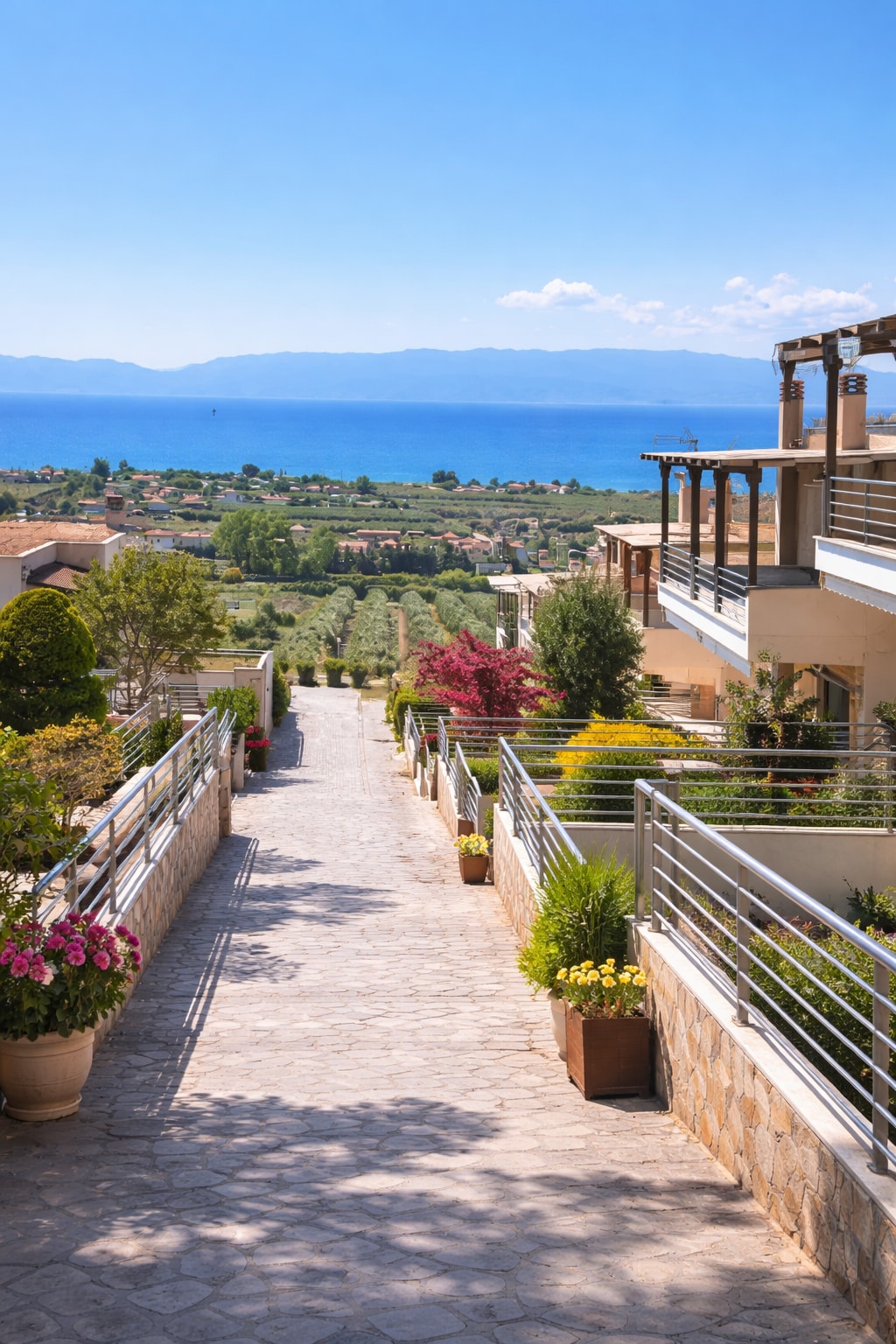Embrace the beautiful ocean views in a great location, just a short walk away from the beach, local shops, bars and restaraunts of Sarti. This is a studio room with queen bed. This is a ground floor apartment that has a private terrace, bathroom/indoor shower and kitchenette. Extra bed available on reqeuest.