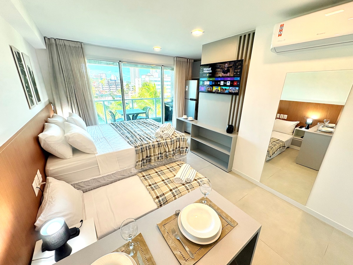 Relaxe e aproveite o melhor de Maceió com vista para o mar 🌊✨. Desperte com o som das ondas e uma vista que fica na memória, estando próximo a tudo que você precisa: shopping, supermercados, farmácias e o palco da principal festa de Réveillon da cidade — o Celebration! O studio acomoda até 4 hóspedes, contando com: Cama de casal e sofá-cama confortáveis, ar-condicionado, TV 40” e uma cozinha equipada. Ideal para casais, famílias ou amigos que desejam curtir o melhor de Maceió com conforto.