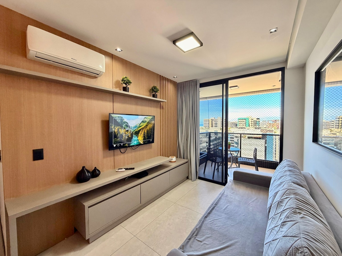 Prédio de frente pra a praia Jatiuca Apartamento aconchegante com móveis novos, ambiente Clean com ar condicionado no quarto casal, cozinha americana completa, sala com TV e internet fibra optica dedicada, máquina de lavar e secar, totalmente decorado.