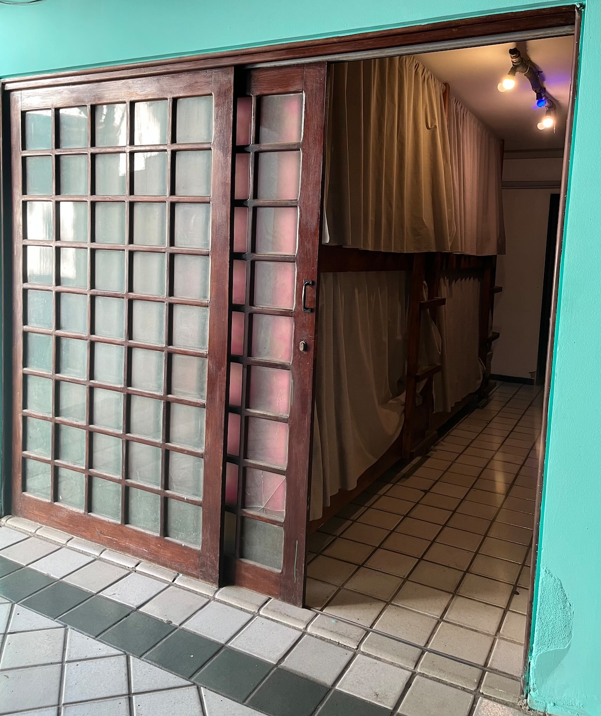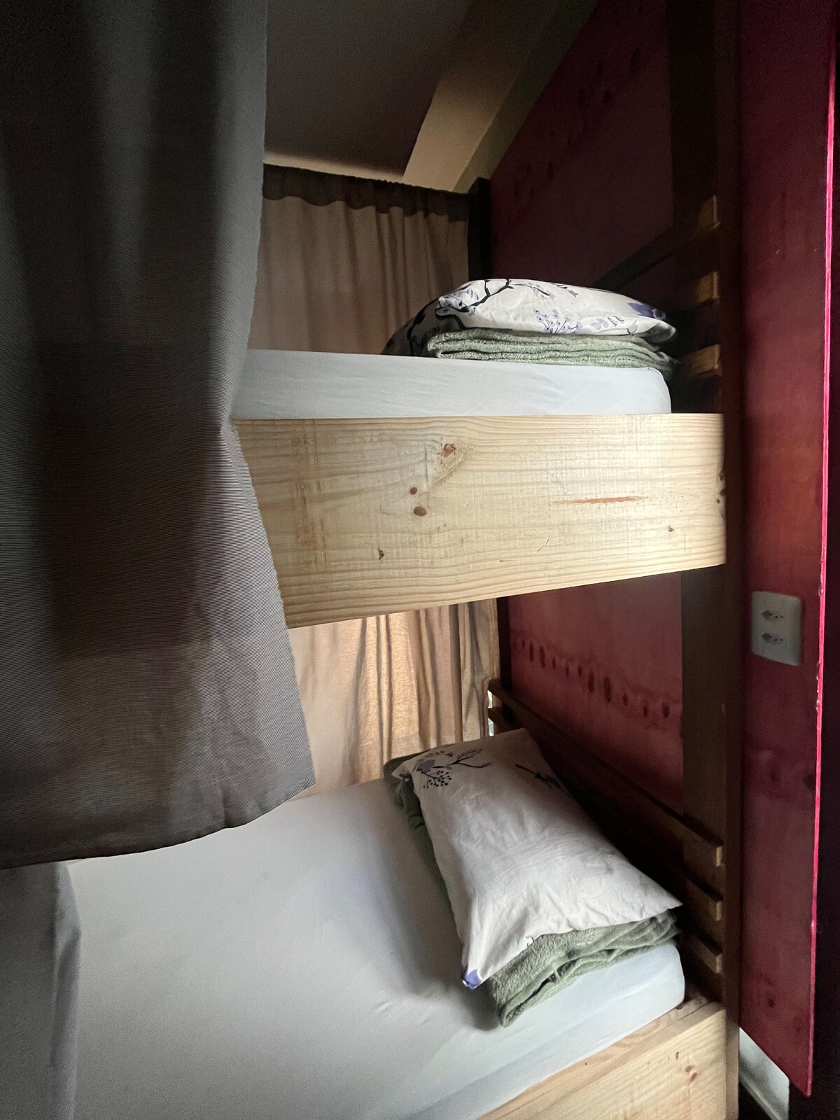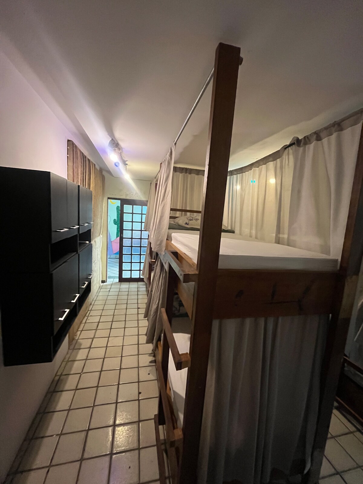 Olá, nossa casa com quarto compartilhado dispõe de beliches super modernas com cortinas que dão maior privacidade individual. O quarto possui ar condicionado, 2 salas de banho com chuveiro frio e quente, 1 lavabo, armário e janelas com vista para área de lazer. Estamos a 200mts da beira mar da Praia de Cruz das Almas, 370mts do Parque Shopping.