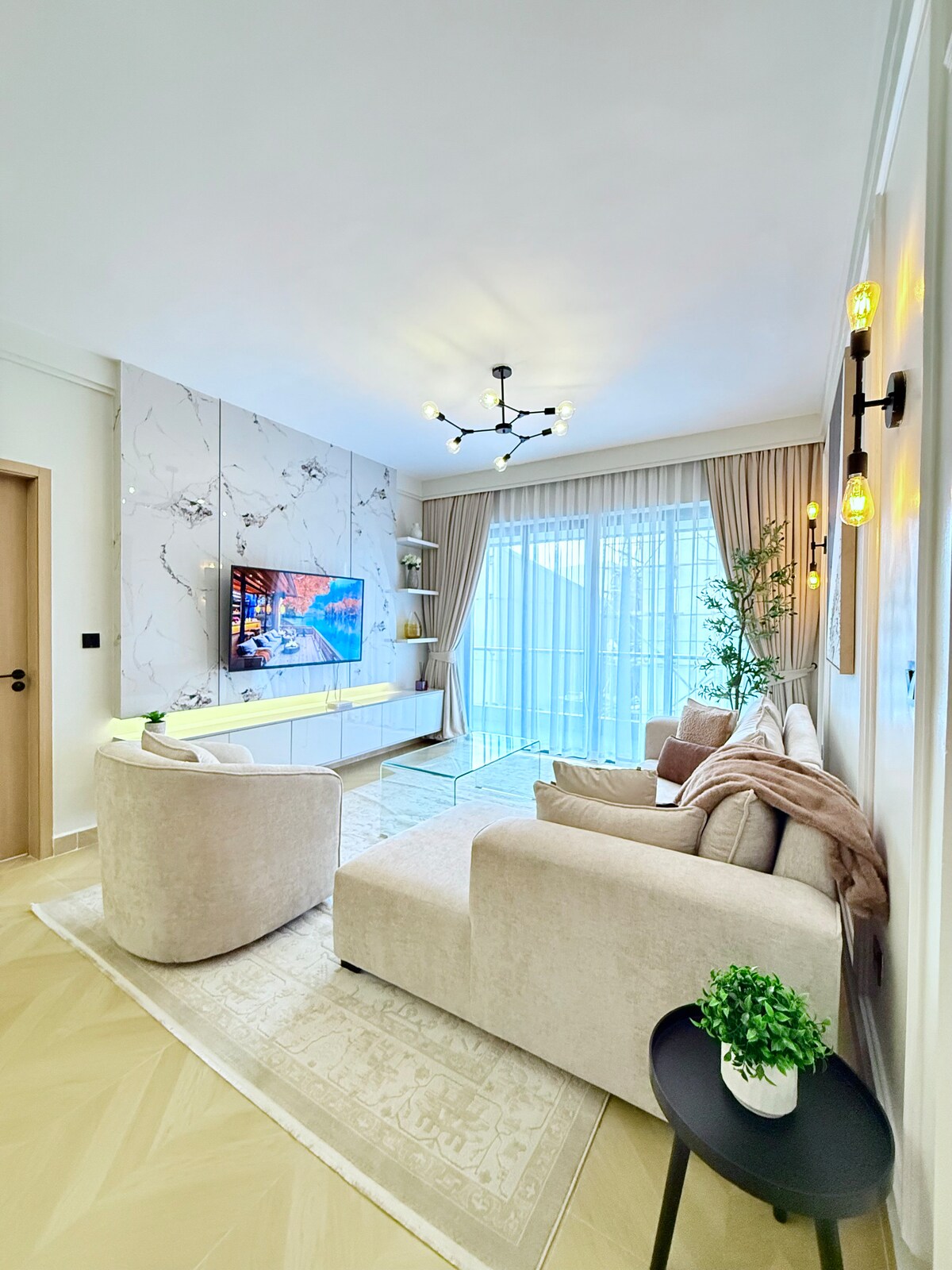 We invite you to enjoy a perfect blend of outside-the-city energy and beautiful surroundings at our two-bedroom modern apartment located in Tatu City just outside Nairobi. Our home boasts easy access to unmatched amenities such as a fully equipped gym, a swimming pool & kids' play area, a 24-hour mini supermarket with delivery services at your doorstep, a restaurant/ chill spot by the poolside, and a peaceful charm of green spaces that rejuvenate your mind and soul.