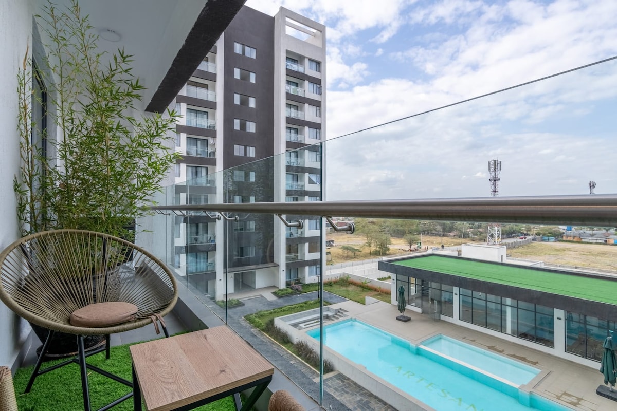 Escape city life in this peaceful 2-bedroom, 2.5-bathroom apartment retreat surrounded by nature in Kenya's most innovative city! This Apartment offers the perfect blend of urban sophistication and natural tranquility in the heart of Tatu City's master-planned community. Relax on your private balcony or terrace or take a dip in the sparkling pool. Perfect for a romantic getaway, family escape, or quiet recharge, this haven offers the ideal blend of comfort, beauty, and relaxation.