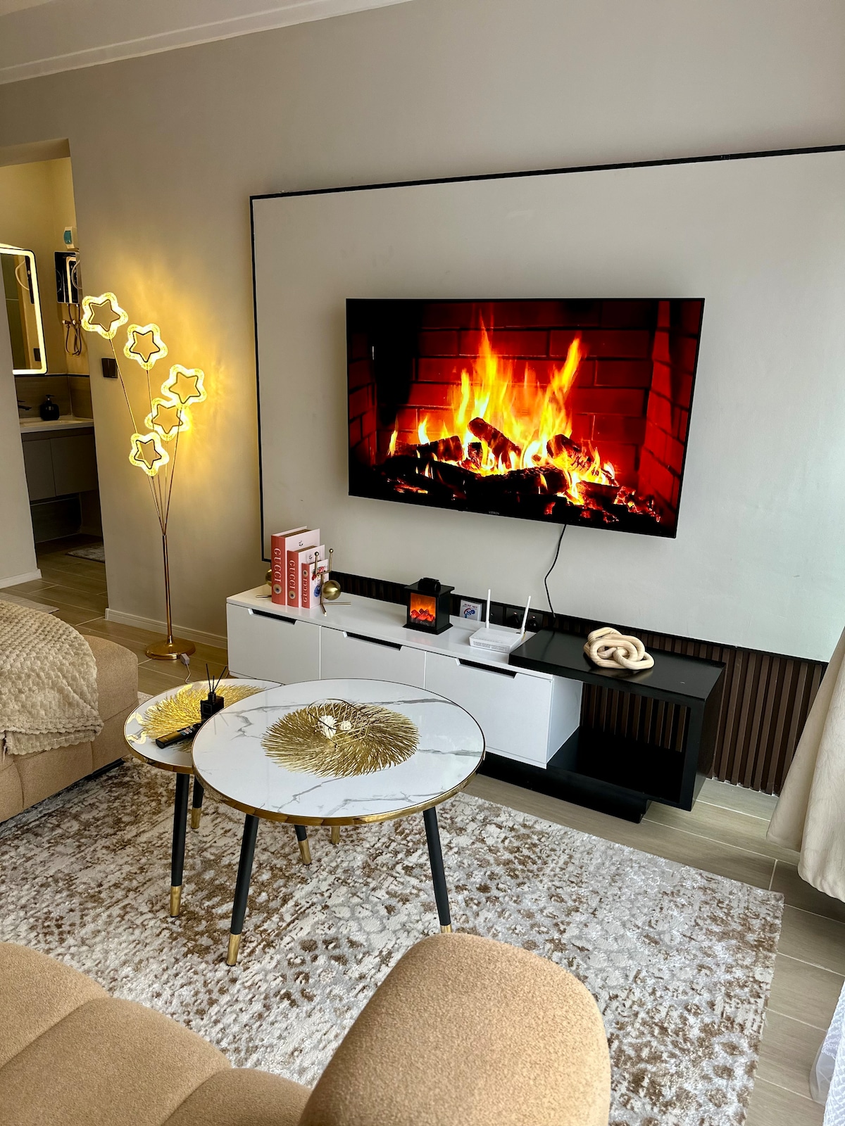 The apartment features two generously sized bedrooms, each beautifully furnished with cozy beds, Sofa Bed ample storage, and a calming ambiance perfect for rest / relaxation. The living area is bright and inviting, with a well-appointed sitting room that includes plush sofas, a smart TV, and tasteful décor, making it an ideal space for lounging or entertaining. The fully equipped kitchen allows you to prepare your favorite meals with ease, complete with all the necessary appliances and utensils.