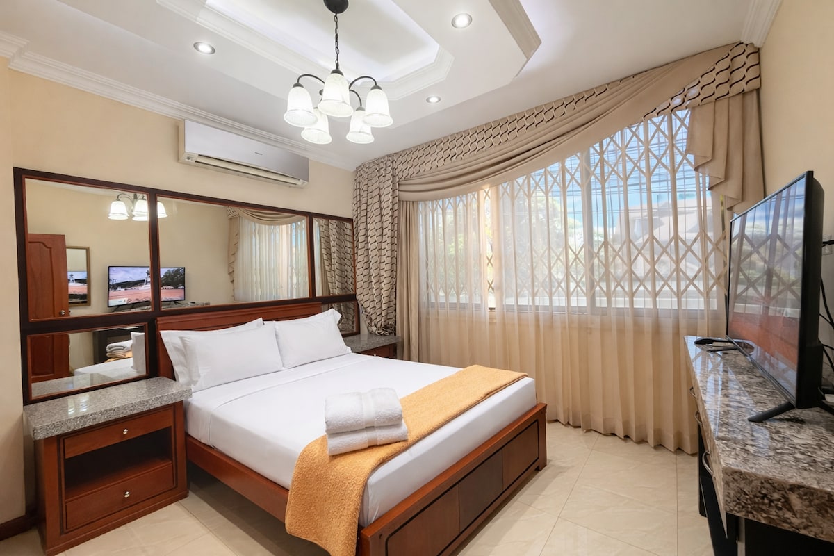 Relájate en una suite cálida y elegante pensada para parejas. Disfruta una cama amplia, iluminación suave, Smart TV gigante y una decoración en madera que crea un ambiente íntimo y relajante. La cocina está equipada para preparar algo especial, y también podrás disfrutar de la piscina y áreas exteriores tranquilas. Ubicación exclusiva en Unioro, cerca de restaurantes y zonas seguras para caminar en pareja.