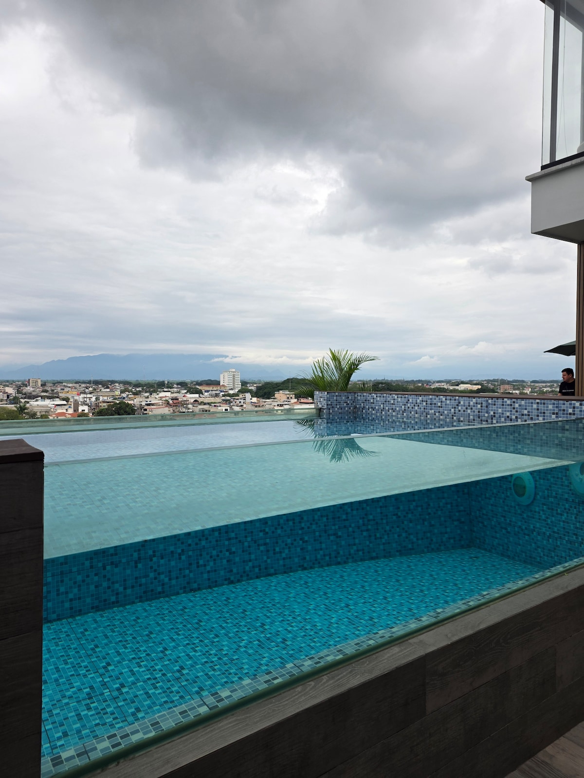 Suite de lujo en Plaza NOAH Vive una experiencia exclusiva en Machala. La suite cuenta con una amplia habitación con cama de dos plazas y media, colchón adicional de plaza y media y televisor. Dispone de balcón, sala, comedor, cocina equipada, baño con agua caliente, lavadora, secadora y lavandería. Además, tendrás acceso a piscina, gimnasio, recepción y ascensor. Incluye parqueo seguro y garaje. En Plaza NOAH disfrutas también de un ambiente moderno con restaurantes de primer nivel.