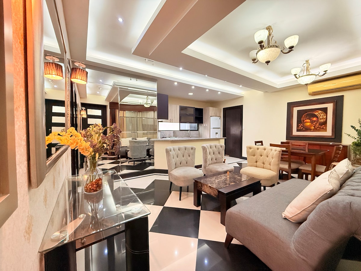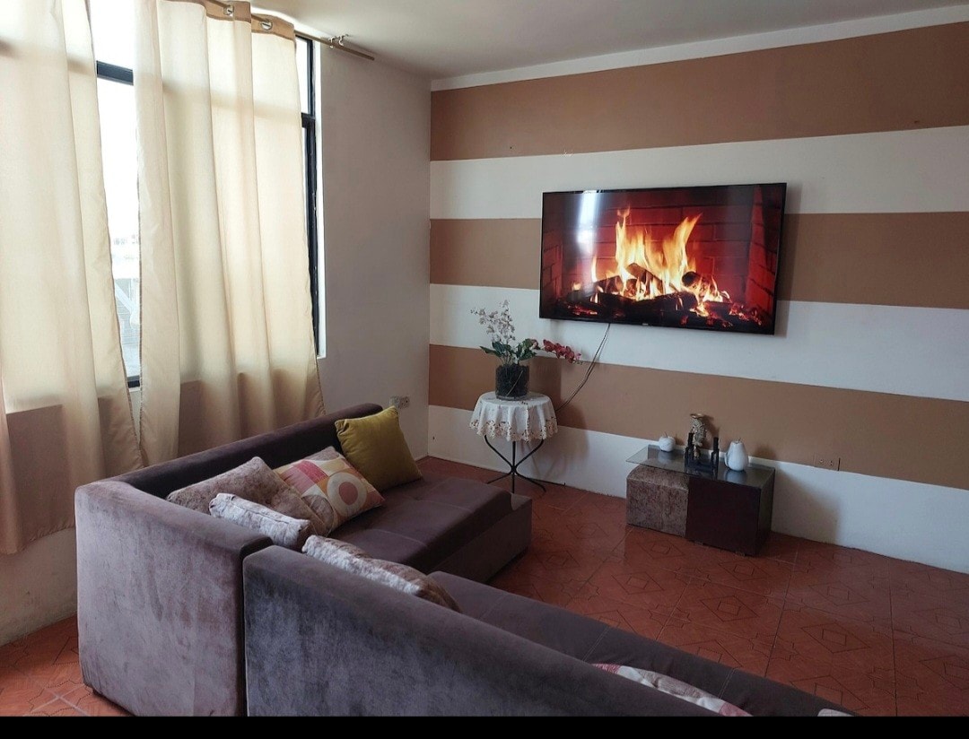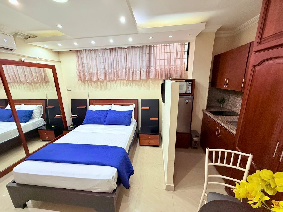 Relájate en este espacio tan tranquilo y elegante. Dispone de 2 habitaciones c/u con TV, A/C, 1 cama matrimonial y 1 cama de 2 plazas, una cocina elegante, sofá, ducha de agua caliente, lavadora, secadora, microondas, etc. Excelente ubicación, a 100 mt. del SuperAKI, cerca de restaurantes y a pocos metros del centro de la ciudad , disponemos de GARAJE CON PUERTA AUTOMÁTICA para su comodidad. A nuestros huéspedes les dejamos AGÜITAS y SNACKS de cortesía. EMITIMOS FACTURA POR SU HOSPEDAJE