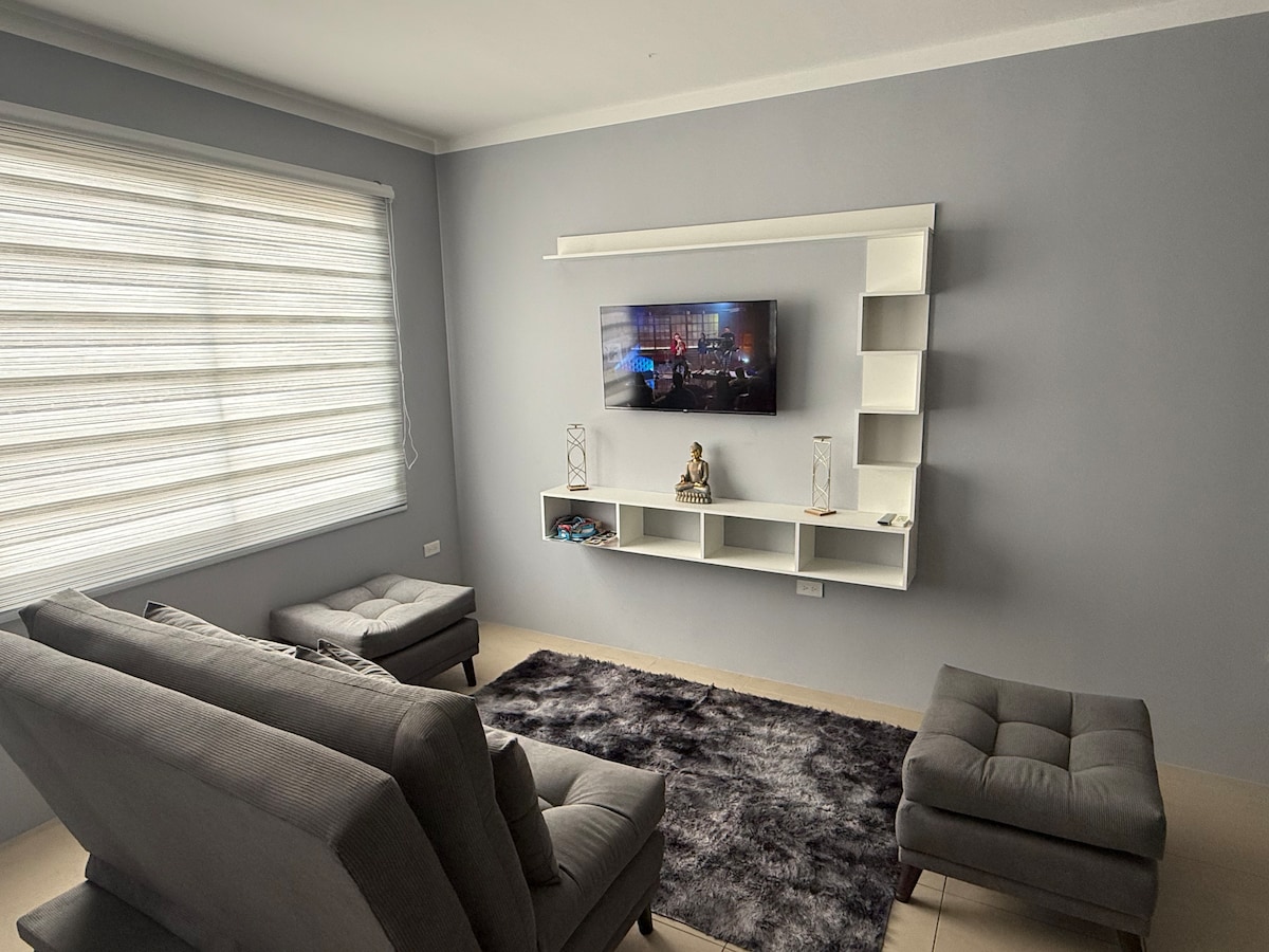 Ubicación privilegiada 📍 A 5 min del terminal, universidad y centros comerciales. Seguridad 🚗 Estacionamiento exterior seguro, vigilado por cámaras frente al dpto. 🔑 Acceso independiente con cerradura eléctrica. 👮♂️ Guardianía 24/7. 🛏️ 2 habitaciones, cada una con aire acondicionado, adecuadas para 3 huéspedes. 🛋️ Todas las necesidades básicas cubiertas. 📺 3 TVs (sala y habitaciones) con Netflix, Paramount+ y Zapping - LigaPro. 🛜 Internet de alta velocidad y alcance.