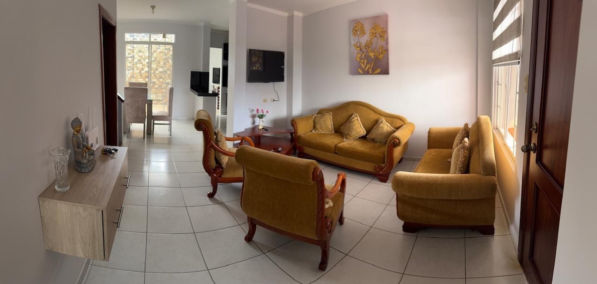 Ubicación privilegiada 📍 A 5 min del terminal, universidad y centros comerciales. Seguridad 🚗 Estacionamiento exterior seguro, vigilado por cámaras frente al dpto. 🔑 Acceso independiente con cerradura eléctrica. 👮♂️ Guardianía 24/7. 🛏️ 2 habitaciones, cada una con aire acondicionado, adecuadas para 3 huéspedes. 🛋️ Todas las necesidades básicas cubiertas. 📺 3 TVs (sala y habitaciones) con Netflix, Paramount+ y Zapping - LigaPro. 🛜 Internet de alta velocidad y alcance.