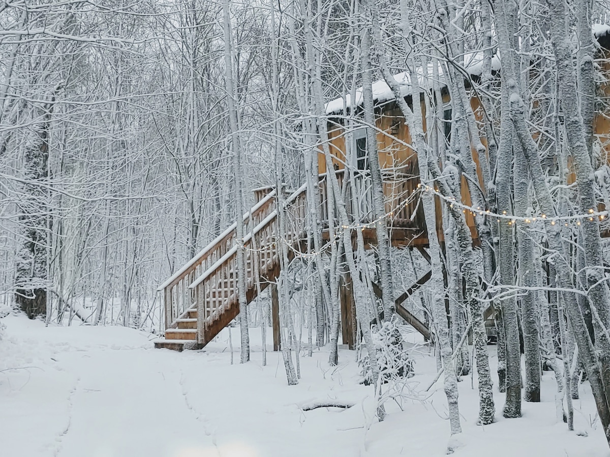Welcome to Treetop Rentals and Farmstead Nestled high up in the trees and surrounded by hundreds of acres of forest, this is a stay you are certain not to forget. With a 3 piece bathroom, hot water and a full kitchenette, this treetop stay will not ask you to sacrifice any of the comforts you look for. Come and recharge with the calm quiet of nature, warm yourself by a campfire and enjoy a spectacular view of the night sky.