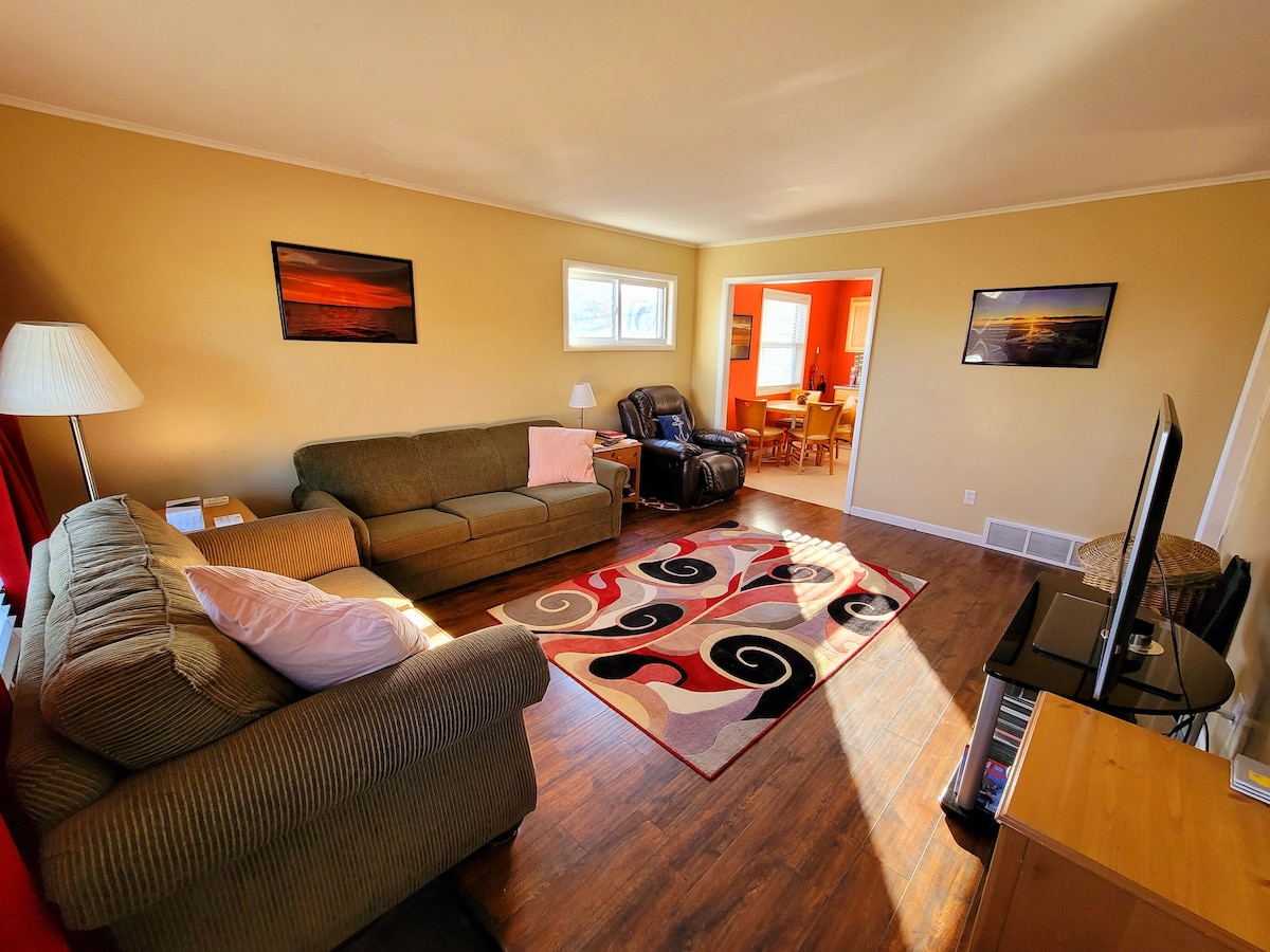 Centrally located, downtown, 800 sq. ft. heated solarium suite - bedroom, living room, small bathroom and kitchenette (toaster oven, microwave, electric frypan, mini fridge - not a full kitchen) and sleeper couch, attached to the back of my home. Private entrance out back, winter access thru the garage. Laundry facilities in the garage. Driveway parking. Well behaved dogs are welcome - see rules. Fenced backyard with fire pit. Solarium is full of plants. Beautiful front water view plus gardens.