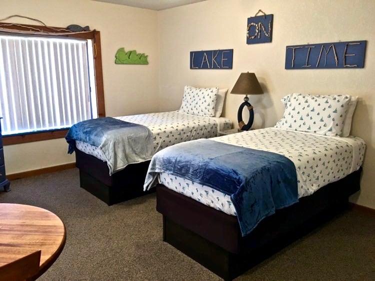 Room has partial panoramic sunset views over the lake. The room offers two single beds with kitchenette and ensuite bathroom on the second floor. This room has no balcony. Room 8 is particularly attractive to fishing buddies or bicycle partners as well as single parents vacationing with a teenage child. Note: Room 8 is located over the restaurant kitchen which closes at 9:30pm Tuesday thru Sunday, but may on occassion produce noise or smell issues.