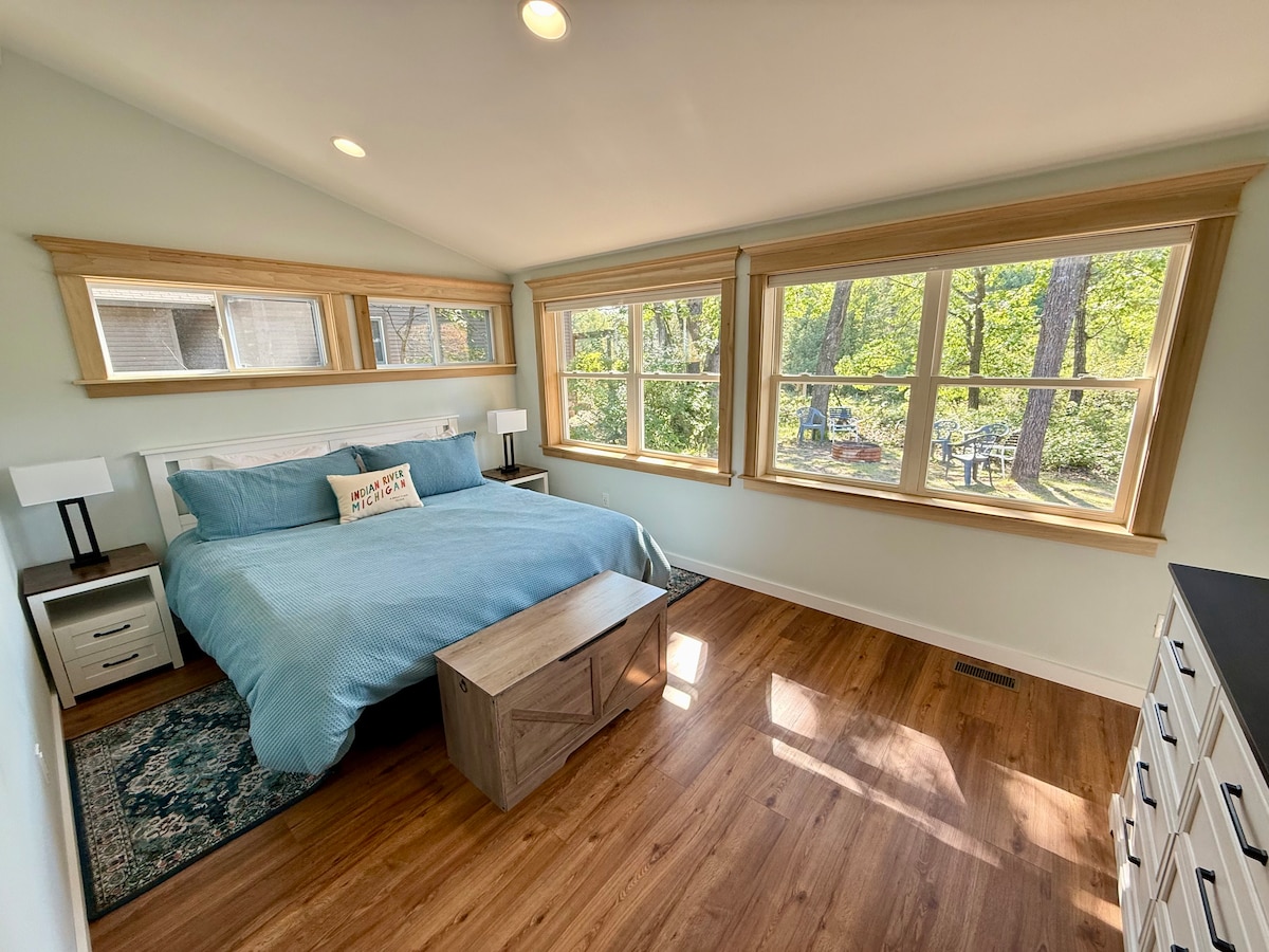 A great location, northside. A must see. Across the street from Mt McSauba nature preserve trails for hiking, 5 minute walk to Lake MI dunes with a beautiful beach & a 2 minute walk to watch the sunset. 2 miles from downtown. Wheelway Bike path & disc golf. Very cozy atmosphere with a fully equipped kitchen, bring your essential oils and relax in the jacuzzi tub, very comfortable beds, fold down couch and cot if needed , washer/dryer, relax by the wood fireplace Sept-May, Fire pit May-Sept