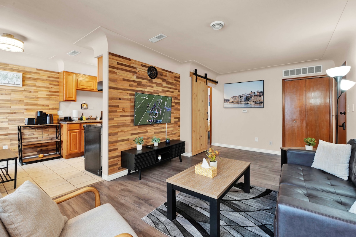 ⸻ Enjoy a safe, private, and newly remodeled second-floor apartment with its own private entrance. This open-concept space is fully equipped with brand-new appliances, stylish furniture, a 50” TV, iron, washer and dryer, and plenty of comfortable bedding to make your stay relaxing and convenient. Located in the heart of the city, the apartment is within walking distance to shops and restaurants, making it the perfect spot for both short and extended stays.