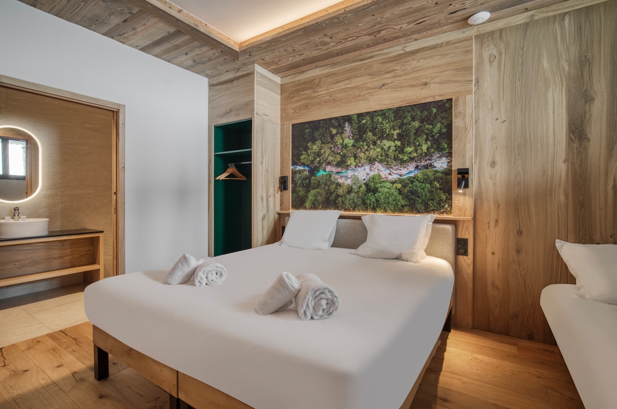 In the heart of the Arc 1950, we offer you a warm alpine apartment, in a 5* residence. 2 bedrooms / 2 bathrooms with bath/WC, fully equipped kitchen (dishwasher, oven, microwave, Nespresso...), one double bed, 2 single beds, sofa, bright living room with TV, terrace, ski-in ski-out, balcony open Services (depending on the opening of the resort): reception 24 hours a day, 7 days a week, covered car park (additional cost), ski locker, jacuzzi/hammam/sauna, indoor/outdoor swimming pool, gym,...