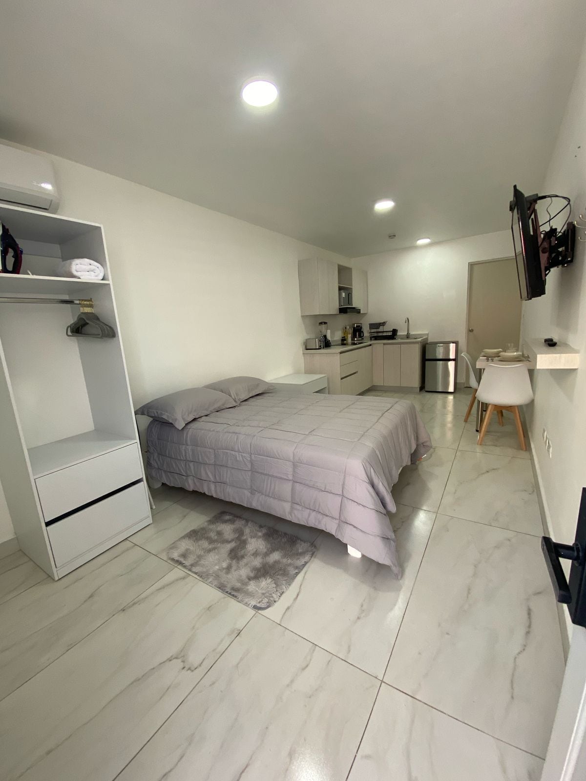 1 recamara con cama matrimonial y sofa cama (4 personas max, ideal 2 adultos y 2 niños, 4 adultos seria incomodo) cocina con mesa. micro, 2 T.V y baño completo NO HAY ELEVADOR y esta en 4 piso. No reservar si tienes problemas con subir escaleras. No reservar si buscas algo de lujo en los afueras. El depa esta remodelado pero afuera no esta moderno-limpio. Sobre la calle a 50 metros del departamento hay olor a drenaje. No afecta olor adentro del depa. Hay mucha basura en los alrededores.
