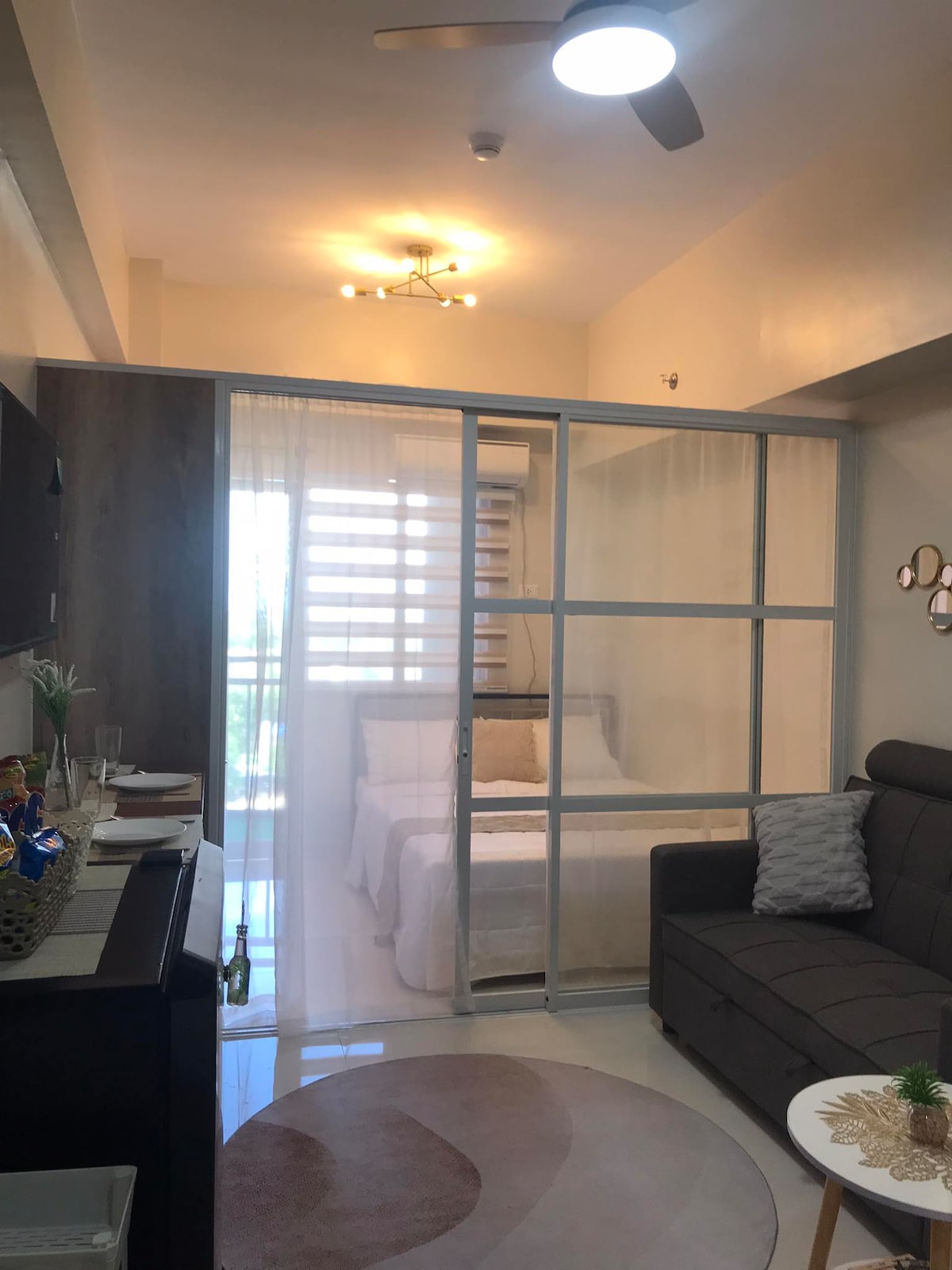 No detail is overlooked at this charming and upscale place to stay. A one bedroom suite inOne Manchester place with a beautiful finish and cozy feel bedroom and a living room that is convertible to a bedroom. Overlooking the beautiful Condos and hotels in Mactan Newtown and right in front of groceries, restaurants, bars, pharmacy and coffee shops. Enjoy the pool, spa and game room within and beach which is only a 5 minute walk. A perfect staycation. You don't need to worry about anything.