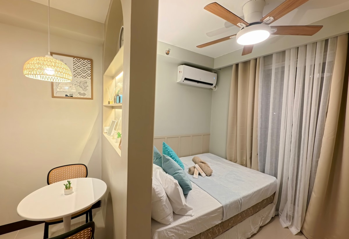 Kick back and relax in this calm, stylish studio unit near Mactan-Cebu International Airport! Inclusions: - Free access to the Pool and Gym - Towels and toiletries - Complimentary Coffee - Hairdryer - Clothes iron - Extra bed linens (upon request) - Wi-Fi About our space: - Pet-friendly - 32 sqm with a balcony facing the pool - Queen-sized bed with 2 bedside outlets - Work desk - Hot and cold shower - Dining area - Smart TV with Netflix - Wardrobe - Kitchen - Washing Machine