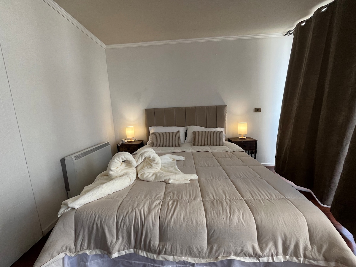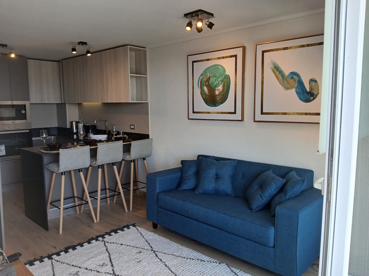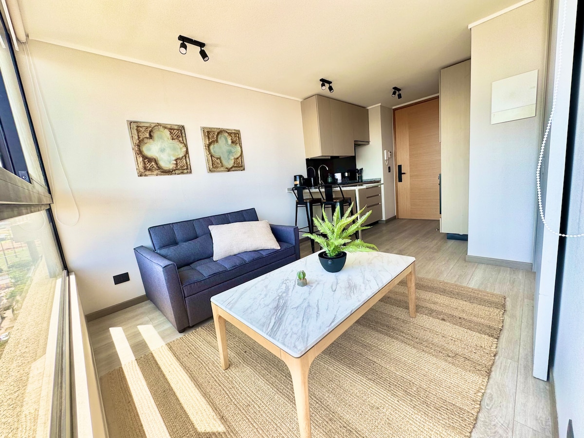 Departamento de un ambiente con increíble vista despejada de la ciudad , luminoso y con una gran terraza , equipado con una cama doble , sillón, S-Mart TV, Wifi, cocina eléctrica con horno, refrigerador e implementos básicos para cocinar, pequeño mesón para sentarse a comer y el baño cuenta con ducha con agua caliente y estacionamiento subterráneo gratuito.