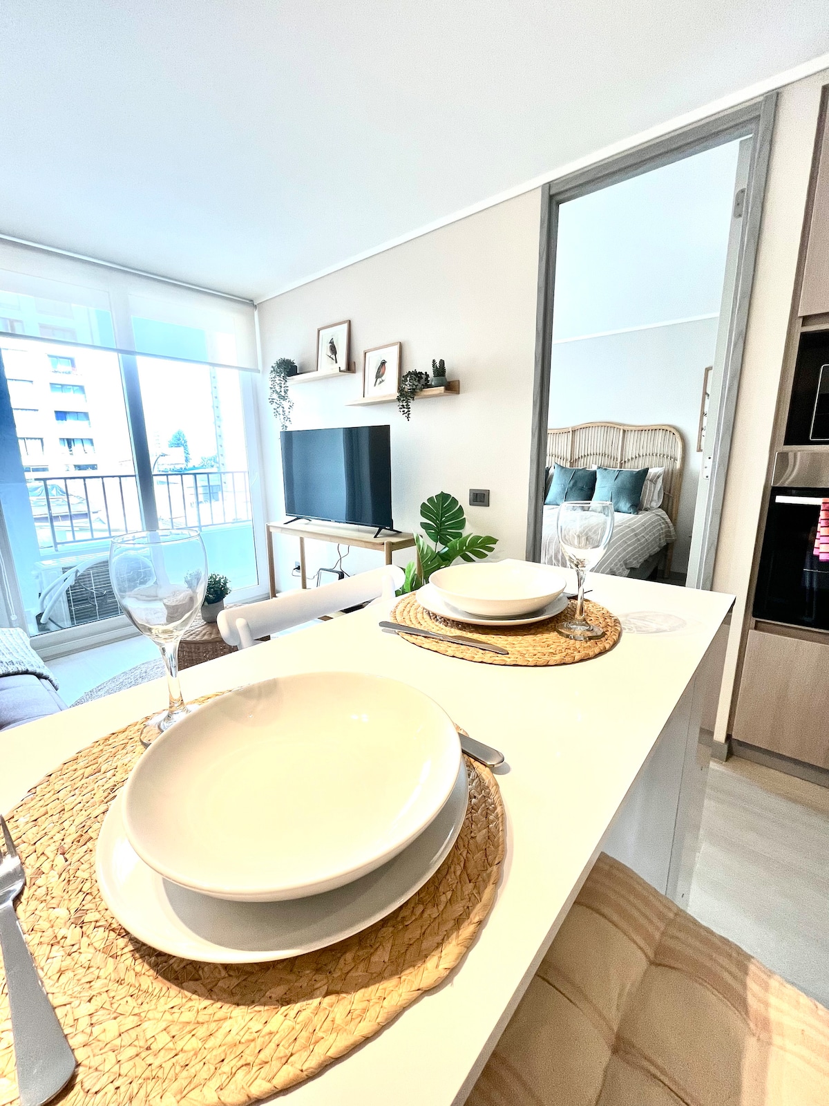 Departamento de un ambiente con increíble vista despejada de la ciudad , luminoso y con una gran terraza , equipado con una cama doble , sillón, S-Mart TV, Wifi, cocina eléctrica con horno, refrigerador e implementos básicos para cocinar, pequeño mesón para sentarse a comer y el baño cuenta con ducha con agua caliente y estacionamiento subterráneo gratuito.