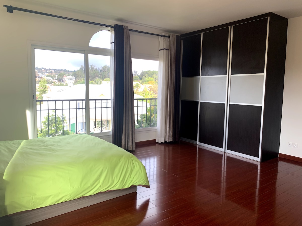 Un appartement de 100m² situé dans un quartier chic de la Haute ville (Faravohitra). L’appartement : - Un portail juste en bord de route, à quelques marches de l’appartement . - L’appartement est bien insonorisé ; une grande salle cosy: une cuisine équipée , d’une salle à manger & le séjour.Le parquet en bois ciré - Les deux chambres sont équipées chacune de SDB privative( baignoire et douche à l’italienne).