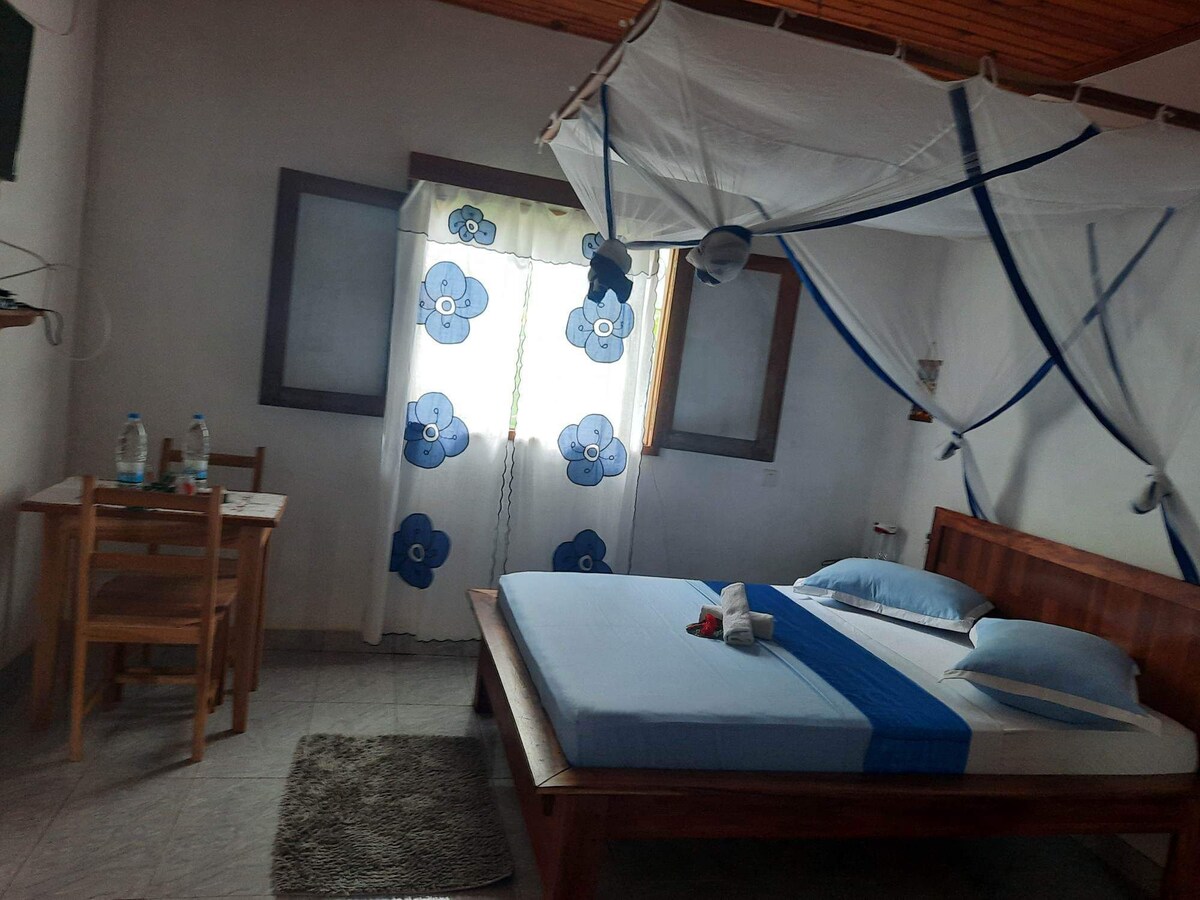 Charmant Studio au bord de mer avec chambre fermée, terrasse et cuisine, au sein d'une propriété familiale. Accès direct à la plage qui se situe en contre bas du jardin. idéal pour accès à toutes les activités : centre de plongée à proximité, centre équestre, départ de bateaux pour Nosy Sakatia, accès piscine naturelle de tortues en snorkeling. Prévoir véhicule pour accéder aux commodités (supermarché et restaurants à 20min Ambatoloaka).
