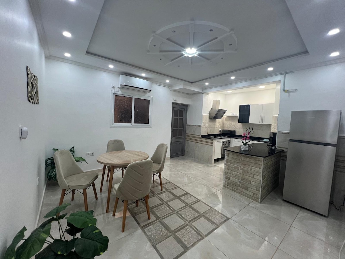 Logement spacieux de 250m2. Terrasse de 70m2. Garage privé. 300m de la mer. Situé dans le centre ville de Ain el turck à Oran. Quartier paisible et voisinage de confiance. Toutes commodités à proximité. Multiples restaurants. Dans notre rue: Grande superettes, Boucherie, Medecins, Pharmacie et coiffeur. Il peut accueillir jusqu'à 8 personnes: 1 lit double, 2 lits simples et 4 sedaris marocains ( comme sur les photos). Nous acceptons que les familles. Lit bébé gratuit sur demande