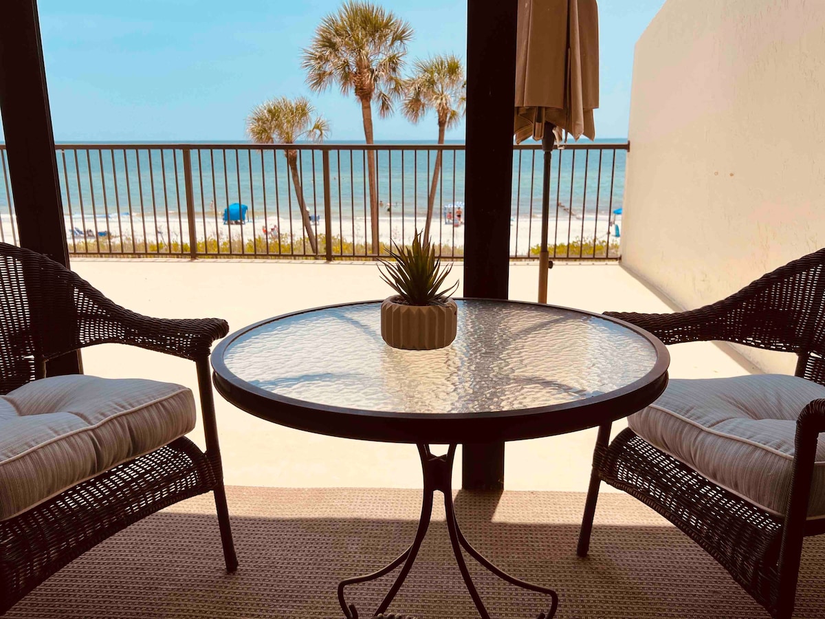 This Gorgeous 1st floor, Direct Gulf-Front condo is located on the South end of beautiful Madeira Beach, directly across the street from World Famous John's Pass Village & Boardwalk. Enjoy this 1/1 + premium queen pull-out sleeper sofa with full-sized kitchen, private heated Pool, Outdoor Grills w/ Tiki Huts on one of the Top 10 Beaches in the US. Best Attractions: Dining, Shopping, Boating, Fishing, Dolphin tours, Jet skiing, Paragliding - ALL w/in Walking Distance! Free covered parking GND FL