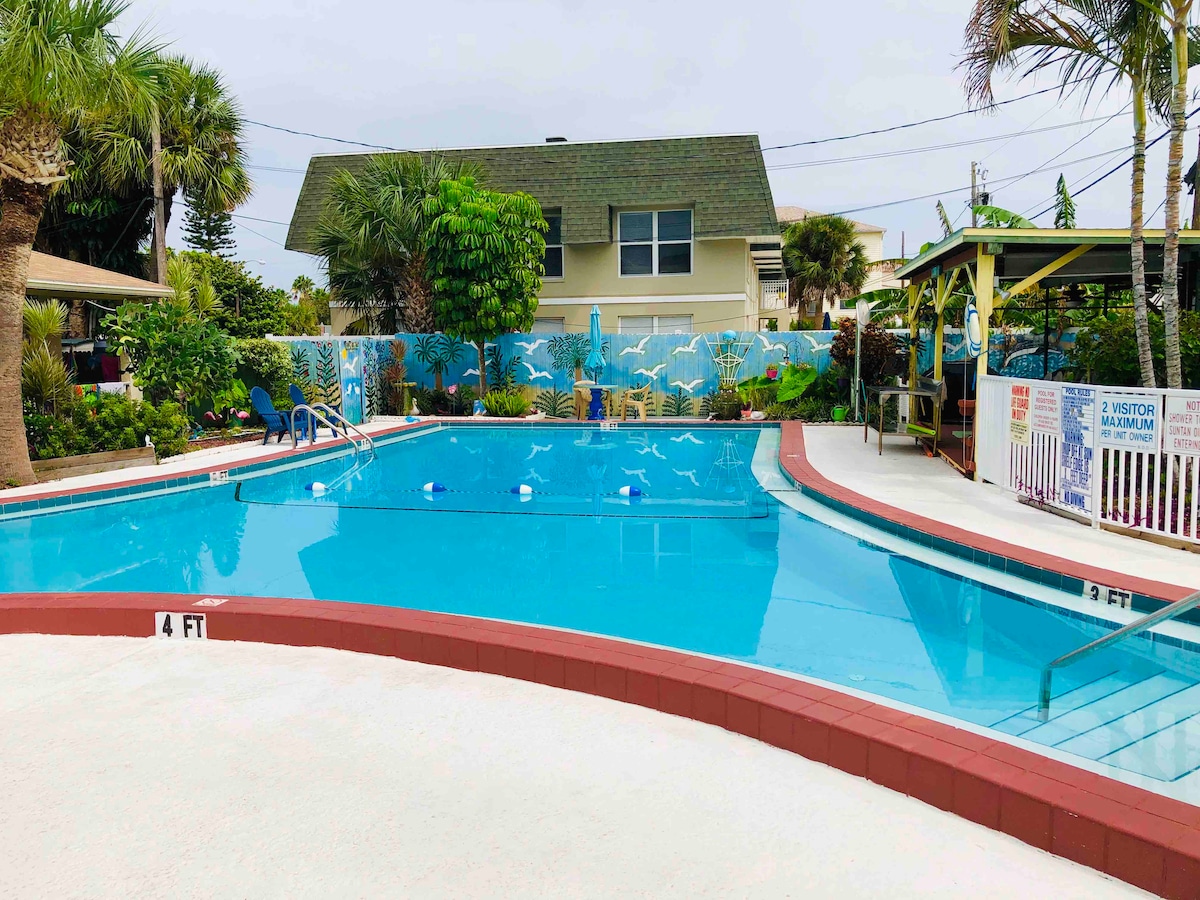 This cozy studio unit with its own screened-in large private patio is the perfect getaway for up to 2 people looking to enjoy the beautiful beaches of this area. Located in a quiet neighborhood on a private cal-de-sac, it is the perfect place to rest and recharge between trips to the most beautiful beaches in the world. This location is just a quick 5-minute drive (2 miles) to the Madeira Beach access and a 10-minute drive (3.7 miles) to the famous John's Pass Village and Boardwalk.