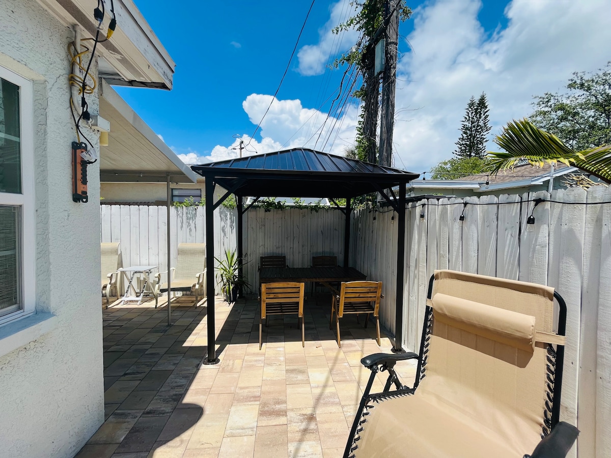 Welcome to Seminole FL! A cozy 1 bedroom home that sleeps 4 conveniently. With a private yard to relax and bbq. Located near beaches, shopping and nightlife. Within minutes to dining and parks with playgrounds, fishing, walking/ jogging/ bike paths and serene views. A 9 minute (3.7 mile) drive to Madeira beach an 20 to 30 minutes to many other popular beaches. A 30 minute drive to Tampa (airport) A 22 minute drive to St Pete (airport) 30 min to downtown.