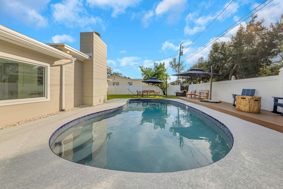 Kick back and relax in this calm, stylish beach-vibin home. The 2 bedroom plus queen size sleeper sofa in sunroom is the perfect spot to get away and never have to leave. Enjoy your morning coffee or afternoon cocktail lounging by the fire pit. Light up the grill and cook your meal while you enjoy a pool heated to 86 degrees for free! Wifi and 3 streaming TV's. If you want to get out and explore, you are only 6 minutes from the award winning beaches and 25 minutes from downtown St Pete.