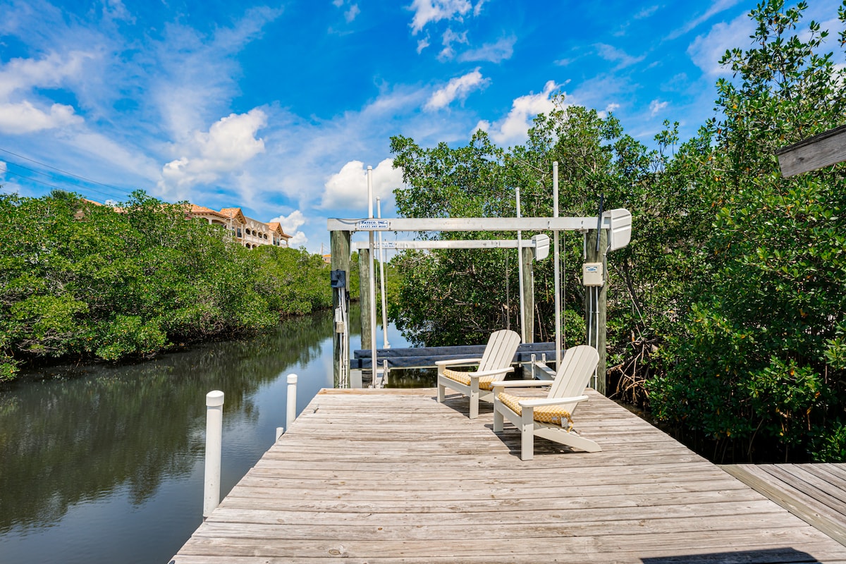 Welcome to Villa Azule, your luxurious Indian Rocks Beach retreat! - Spacious 2,646-square-foot waterfront haven with stunning canal views. - Two king master bedrooms and a queen bedroom, accommodating up to 10 guests. - Outdoor amenities include a boat lift, propane grill, fire pit, bikes, and kayaks. - Open concept living area perfect for relaxation and entertainment. - Close to local shops and a 10-minute walk to the beach. - Complimentary sparkling wine awaits your arrival.