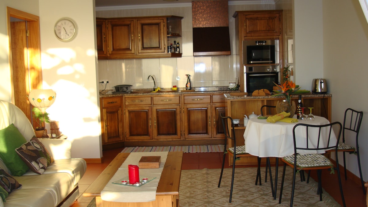 Studio, tipologia T0, rés do chão, moradia moderna e plana, acesso sem degraus. Tem 1 cama de casal, 1 sofá cama, uma casa de banho com duche, sala com cozinha completa, onde poderá preparar as suas refeições. No exterior, poderá se sentar e usufruir das paisagens, tem também uma churrasqueira que pode usar gratuitamente. Neste espaço podem-se acomodar três pessoas perfeitamente. Decoração simples e moderna. Fica a 10 minutos caminhando a pé até ao centro de Santana ou a Rocha do Navio.