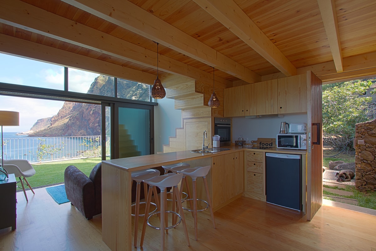 Wake up to absolute mind blowing scenery in this mezzanine featuring floor to ceiling high windows facing the island's stunning coastline, often requiring a second look to truly appreciate the beauty that this magnificent island has to offer. The mezzanine accommodates two people, has an ensuite bathroom, a fully equipped kitchen and also has access to its own private garden. Needless to say, our infinity pool is also there for you to enjoy and relax. Free parking is available in Jardim do Mar.