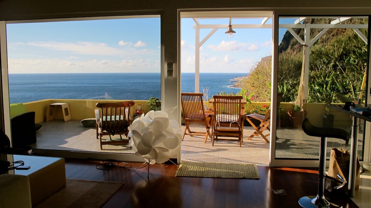 Lazy Lizard by the Ocean - Attic Studio with an area of 38 sqm and a terrace with ocean and mountain view of 17 sqm and offers a serene escape with breathtaking ocean views and a traditional atmosphere. This charming retreat is perfect for those looking to unwind and enjoy the natural beauty of Madeira. The studio have a equipped kitchen and bathroom, a double bed and a sofa, smart 101 cm TV, fiber optic internet 500/100. The access is on the separately stairs from the rest of the building.