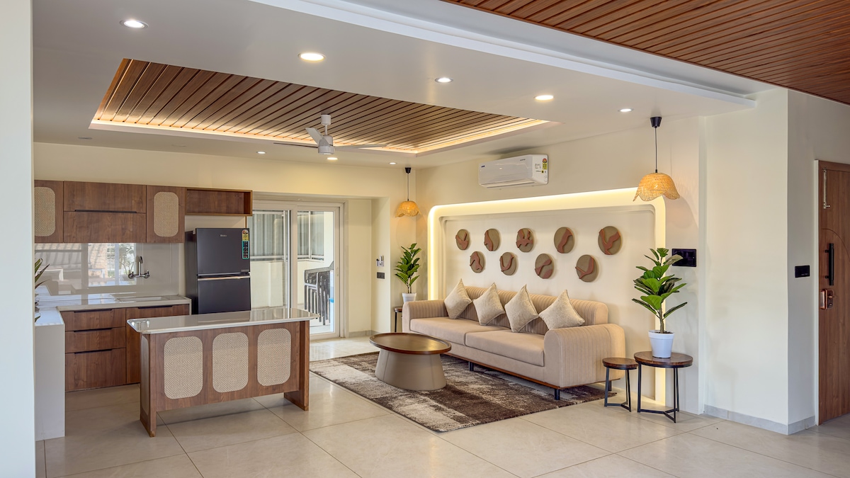 Enjoy a comfortable and stylish stay in this modern, spacious 1BHK luxury apartment, thoughtfully designed to accommodate up to 4 guests. A comfortable king-size bed, while the living area includes a king-size sofa cum bed, making it ideal for families, couples, or small groups. The apartment offers two premium bathrooms, ensuring convenience and privacy. A fully equipped kitchen allows you to cook with ease and step outside to the peaceful outdoor sitting area, perfect for morning tea .