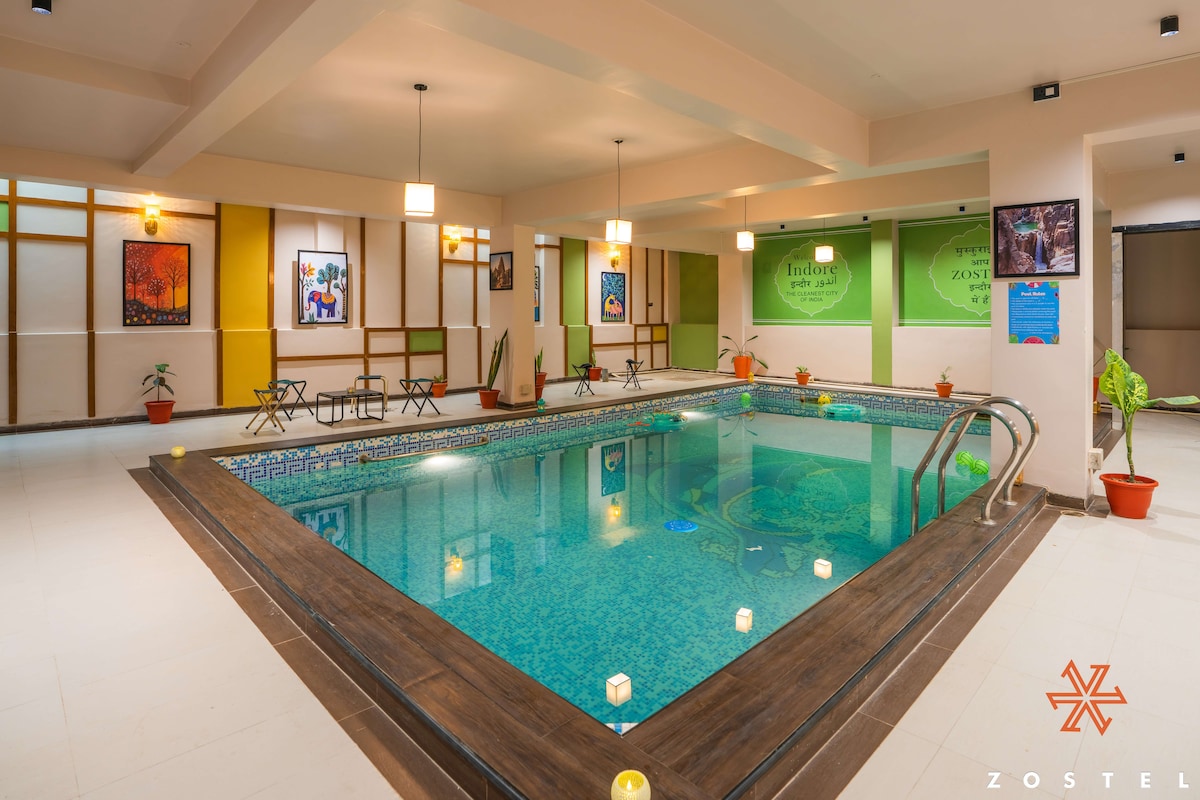 Indulge in premium comfort with this luxurious room that comes with a queen-sized bed, a work desk, a TV, an AC, a sofa, a walk-in closet, & an ensuite washroom. Zostel Indore brings you all the right flavours of the city- clean streets & relaxed stays. Start your day with a refreshing yoga session in our small yet cosy garden area. Then dive right into our pool, accompanied by lounging spaces that invite afternoon siestas & poolside conversations.